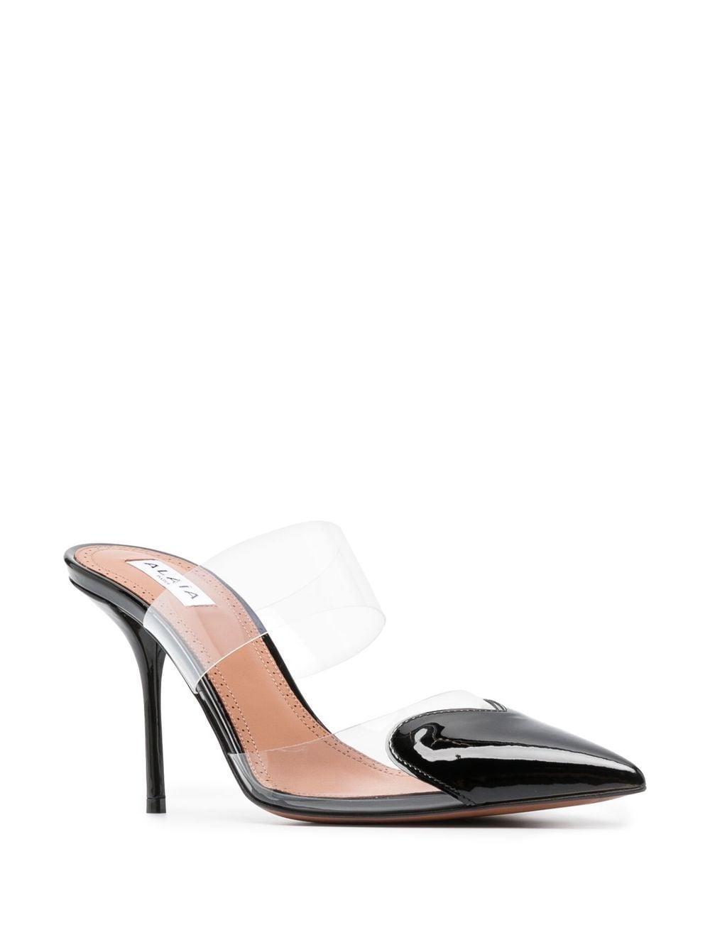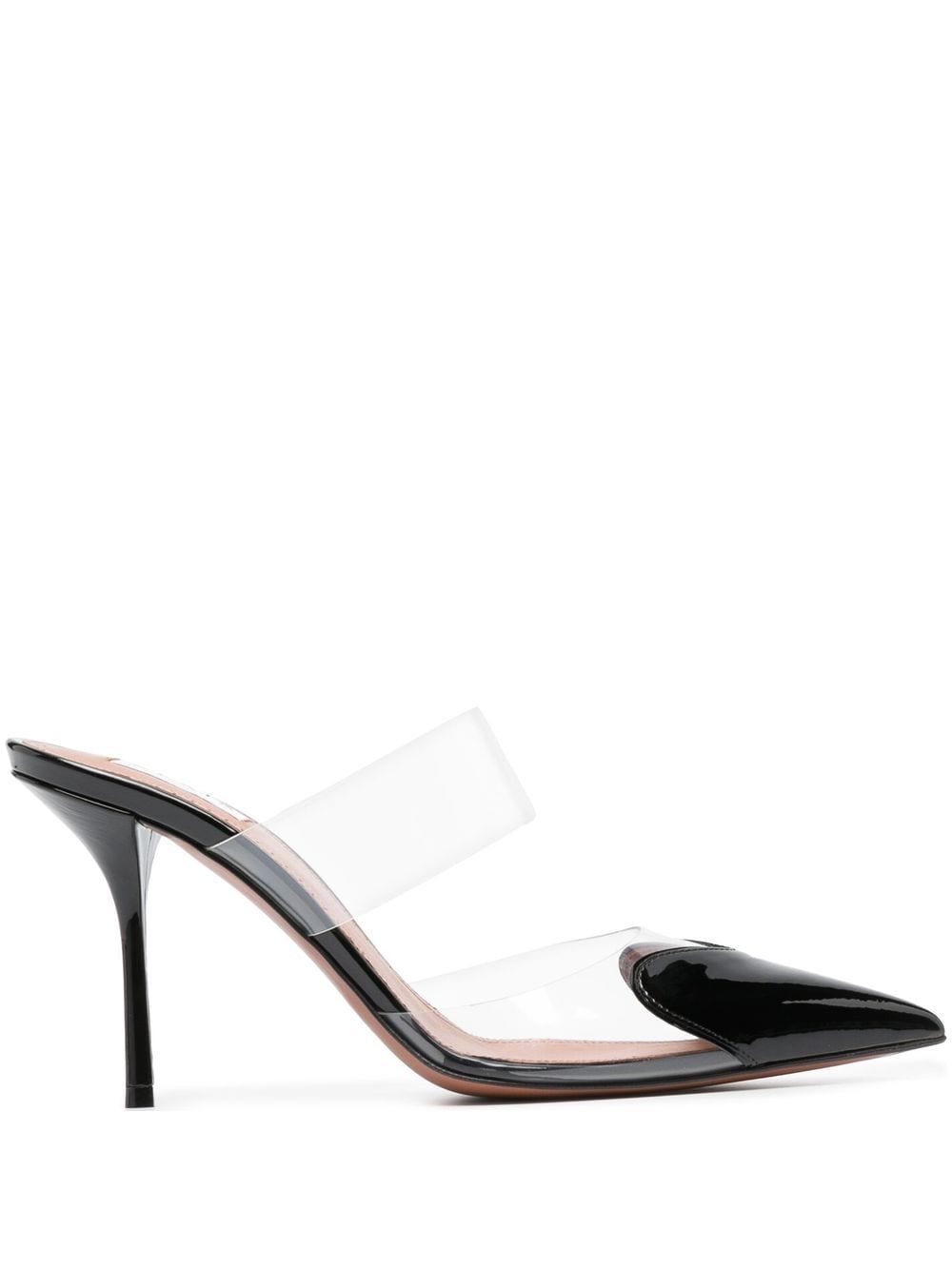 Cœur 90 mm Mules z Alaïa z Alaïa z czarną, cielątną skórę, spiczastą palcem, przezroczystym designem, motywem serca, markową wkładką, stylem poślizgu i pięty na wysokim stiletto.