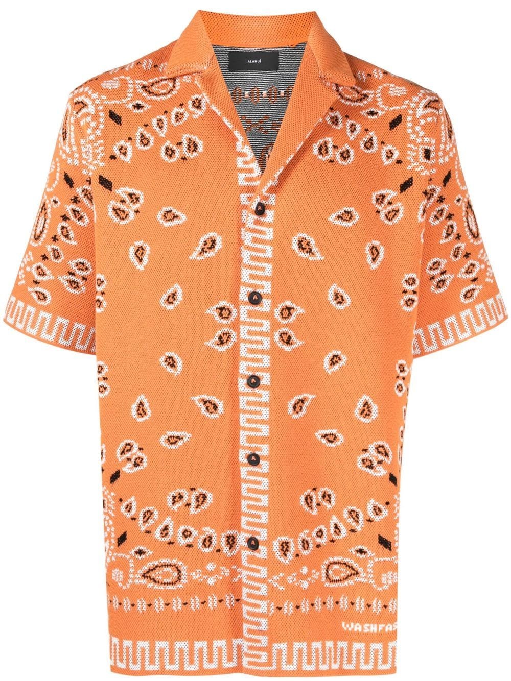 Bandana-Motif koszulka Piqué z Alanui z pomarańczową, bawełnianą, Paisley Print, Piqué Weave, Full Jacquard, kołnierz kubański, mocowanie guzików, krótkie rękawy i prosty rąbek.