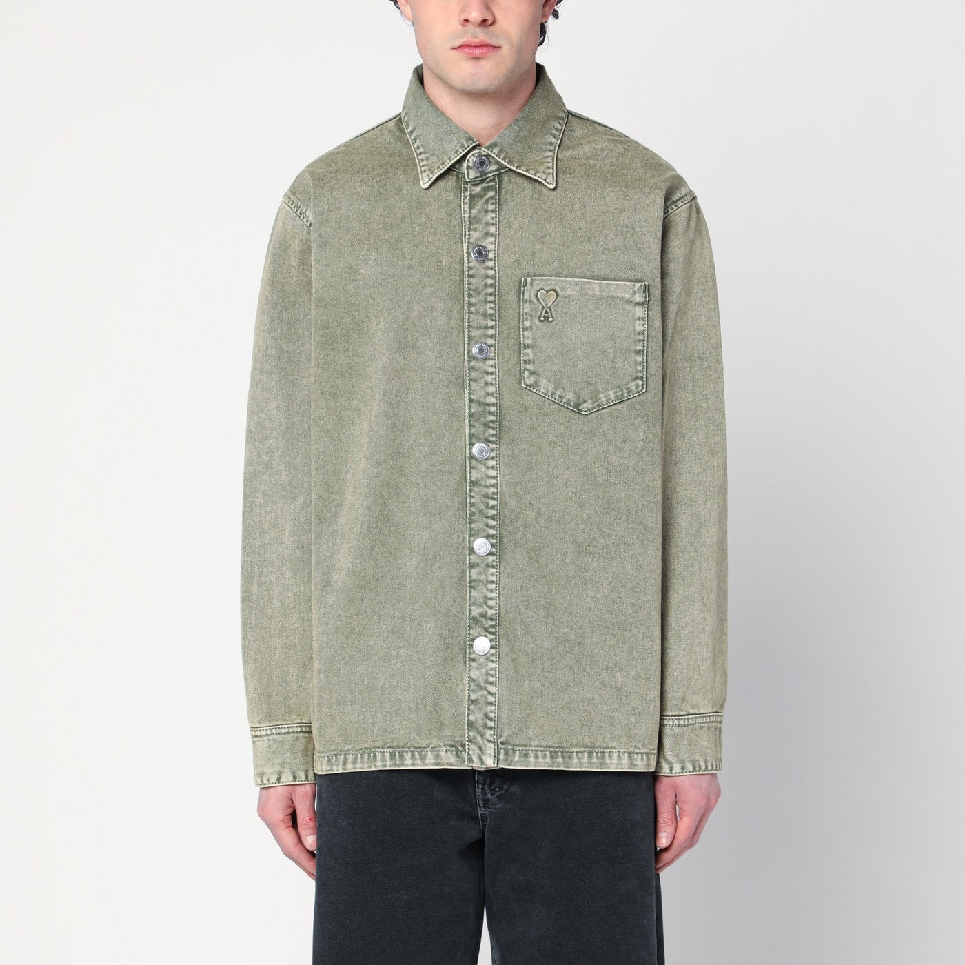 Kurtka koszuli Ami Paris w szałwii zielonej bawełnianej dżinsie, zawierająca klasyczny kołnierz, długie rękawy z zapinanymi mankietami, kieszeń na klatce piersiowej z logo Ami de Coeur ton-na-tone, przednie zapinane na guziki i boczne szczeliny.