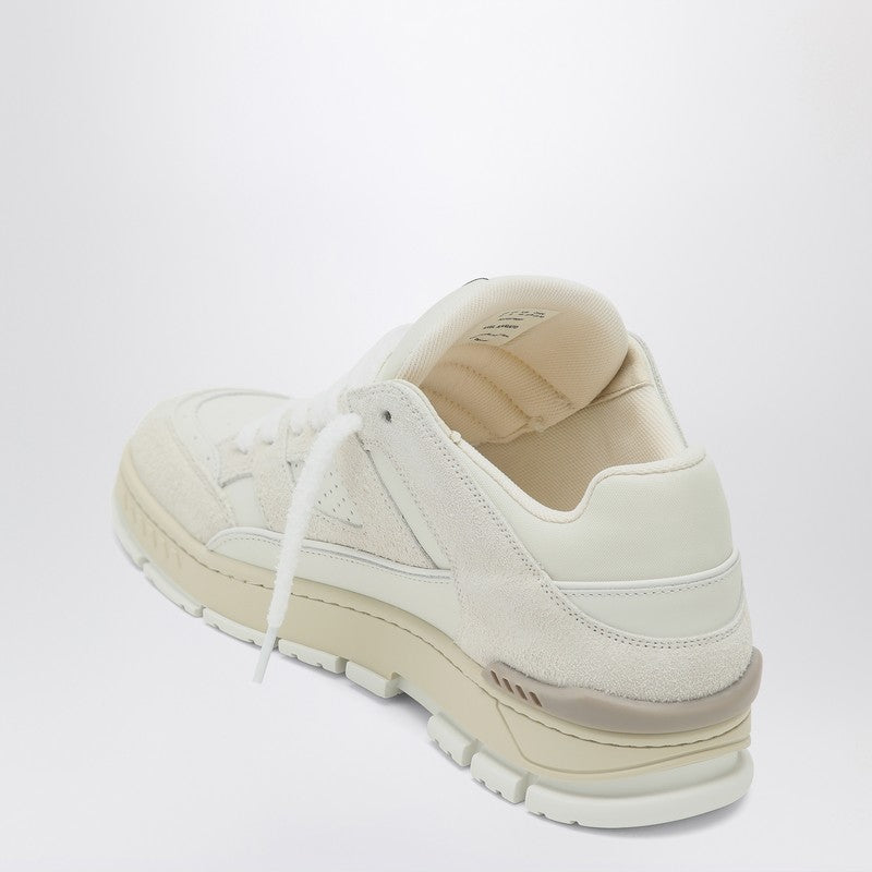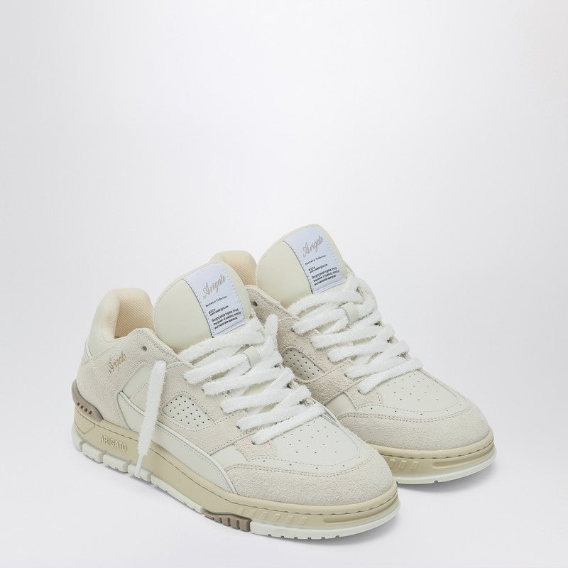 Lekkie beżowe skórzane trampki AXEL ARIGATO, zawierające zamszową górną górną część, koronkową zamknięcie, perforowane okrągłe palce u stóp, boczne literę logo, język z łatką logo, markową gumową podeszwę i spoiler pięty.