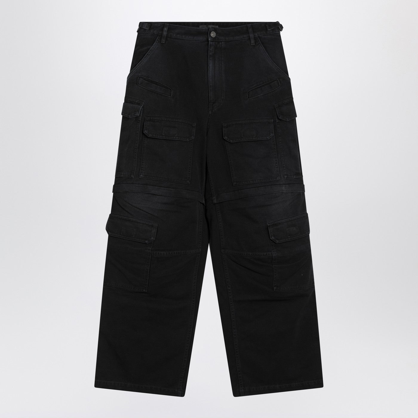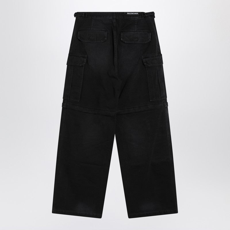 Black Cotton Twill Dżinsy autorstwa Balenciaga, zawierające pętle pasowe z regulowanymi paskami bocznymi, zamywaniem zamków i guzików, czterema przednimi kieszeniami do kaset, kieszenie ładunków, kieszenie klapy z tyłu oraz etykietę logo z tyłu.