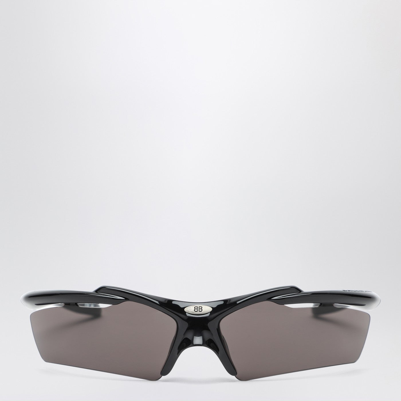 Okulary przeciwsłoneczne Balenciaga w wstrzykniętym czarnym nylonie, charakteryzujące się prostokątnym kształtem, inteligentnym dopasowaniem, metalowym znacznikiem z logo BB na środku ramy, logo wygrawerowane na świątyniach, szare soczewki z ochroną 100% UVA/UVB.