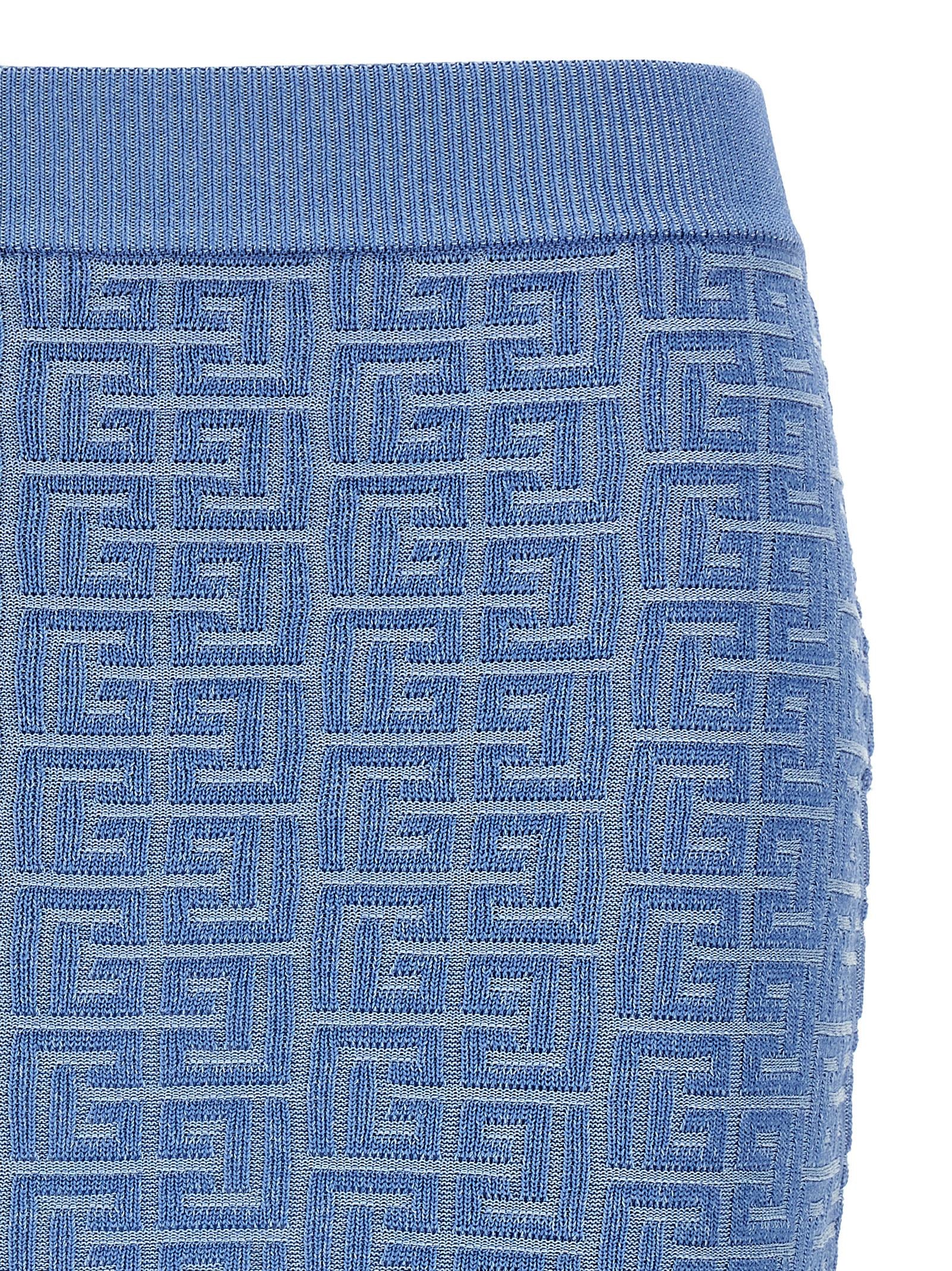 Mini spódnica z wysokim stanem PB w błyszczącej dzianiny z wzorem monogramu PB labirynt, elastycznym paskiem z zamykaniem zapinanym na zamek błyskawiczny.