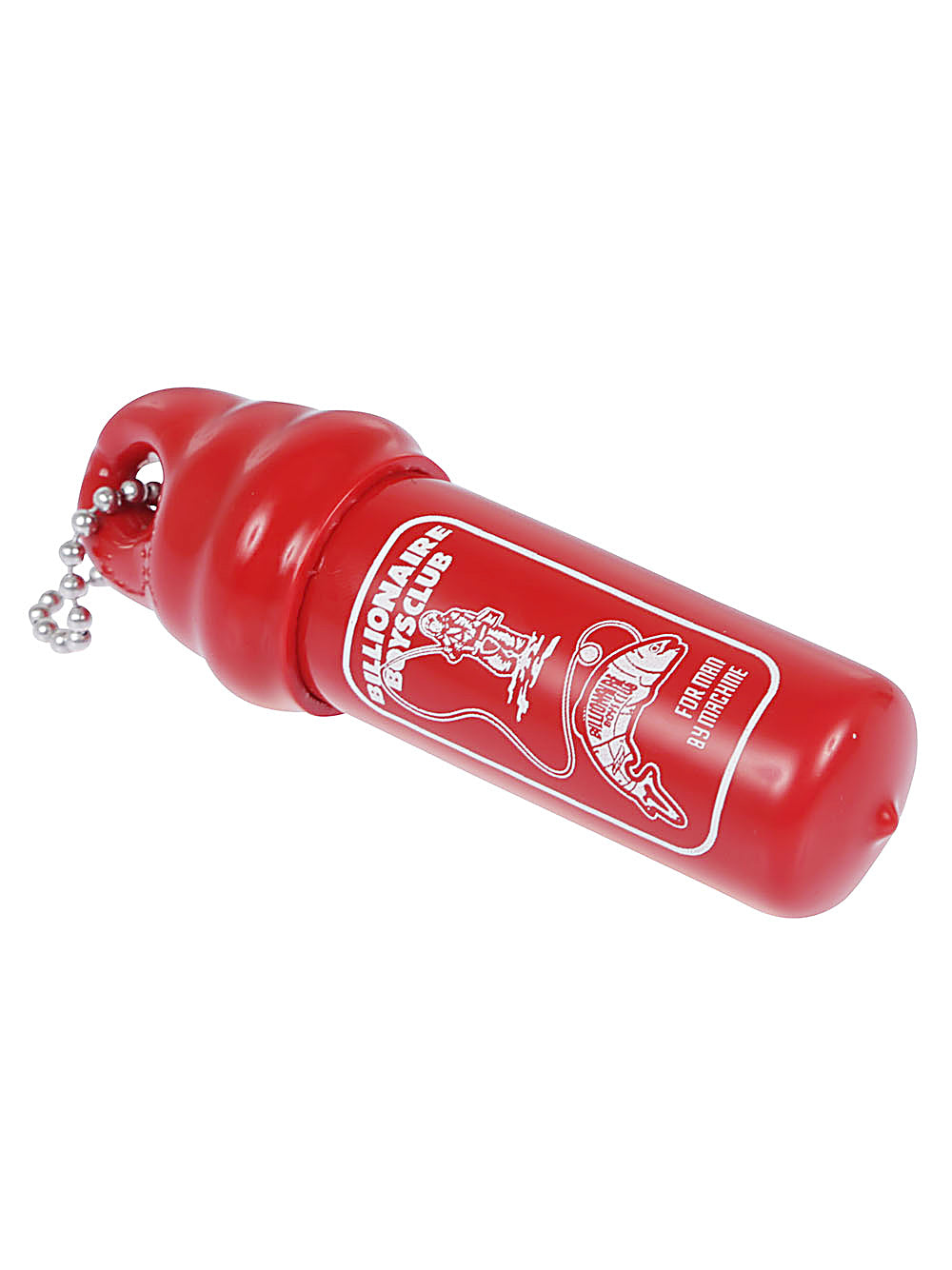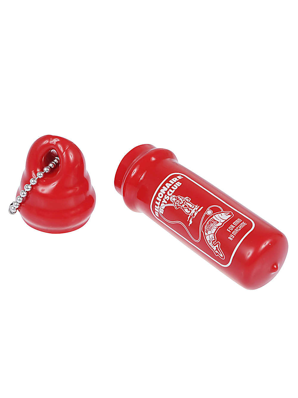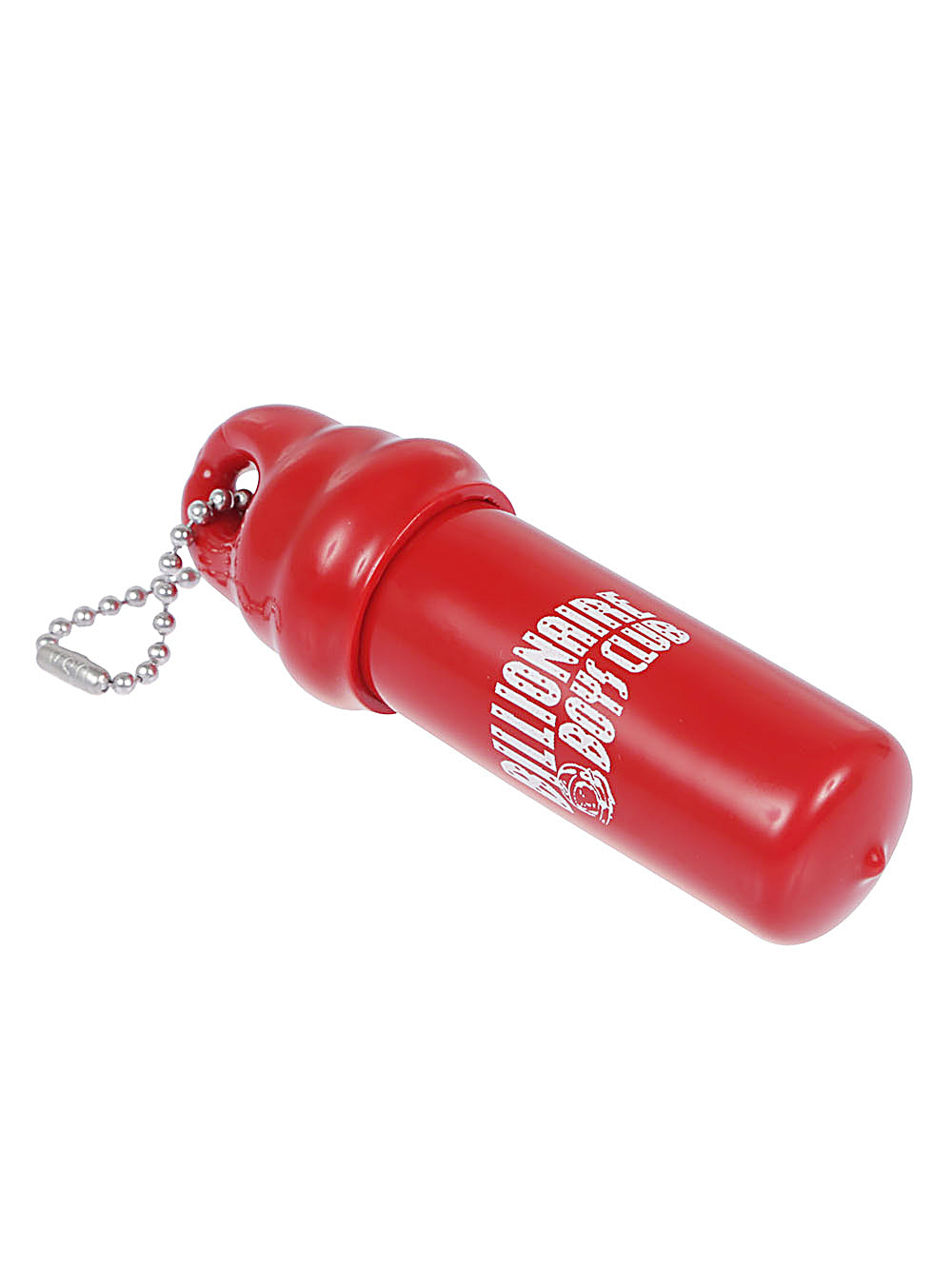 Red, with white writing detail on the side, ball chain, hidden interlocking opening.
