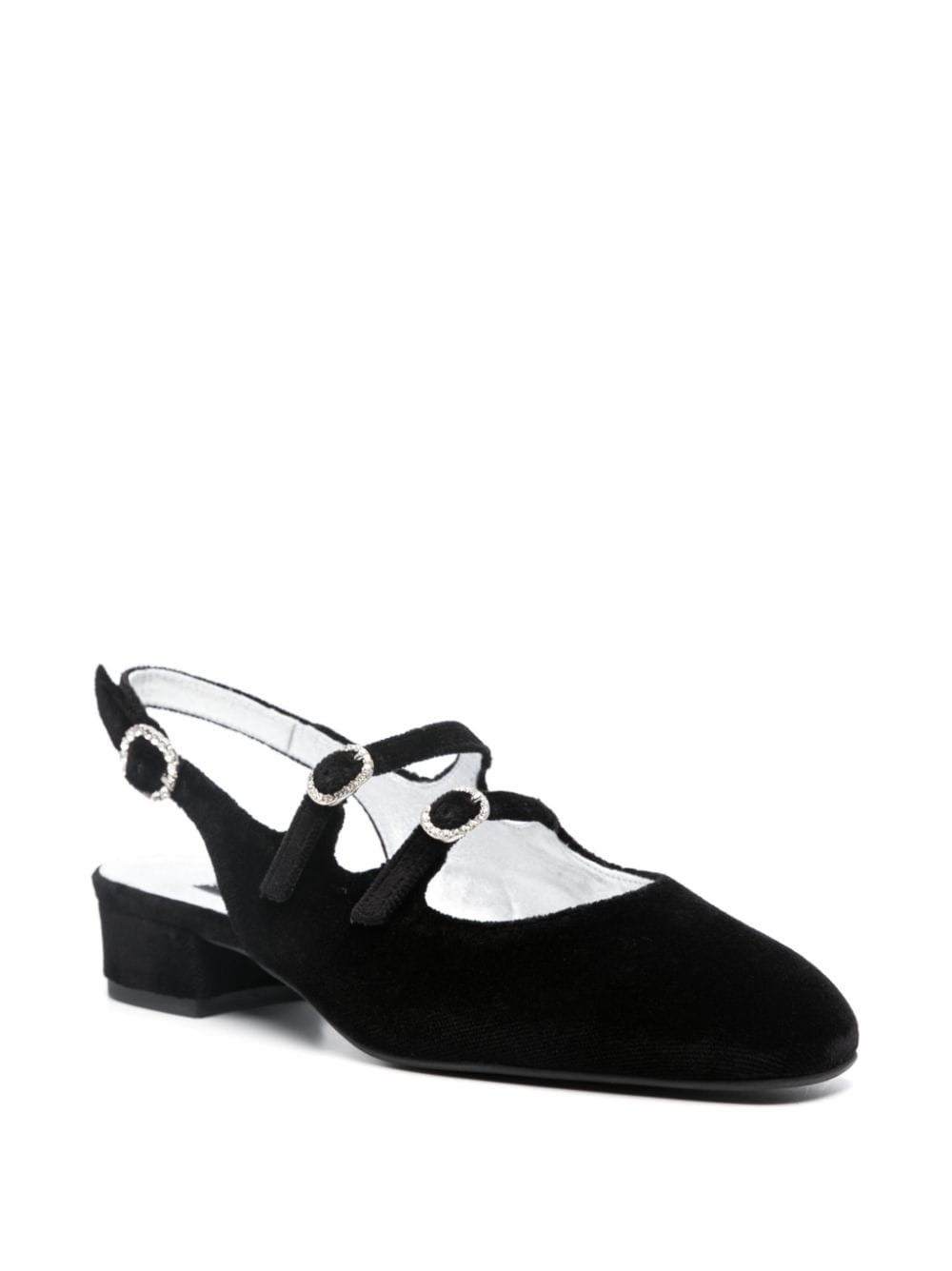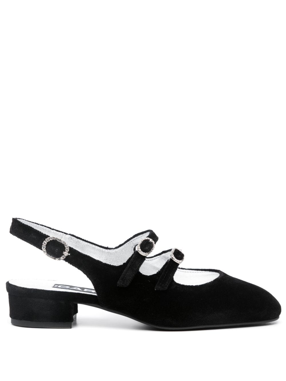 Peche Velvet 30 mm Mary Janes z Carel Paris z czarnym, aksamitnym wykończeniem, błyskotliwym paskiem sningback, ozdobą kryształową, palcem migdałowym, markową wkładką i nisko blokową piętą.