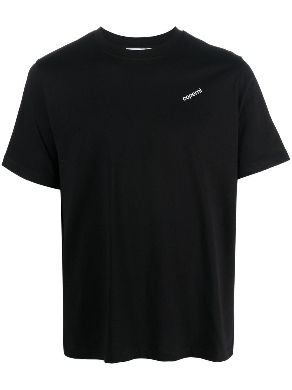 Haftowana koszulka z krótkim rękawem Logo z Coperni z odrzutowcem czarnym, bawełnianym, dzianinem, haftowanym logo na klatce piersiowej, okrągłą szyi, krótkim rękawem i prostym rąbkiem.