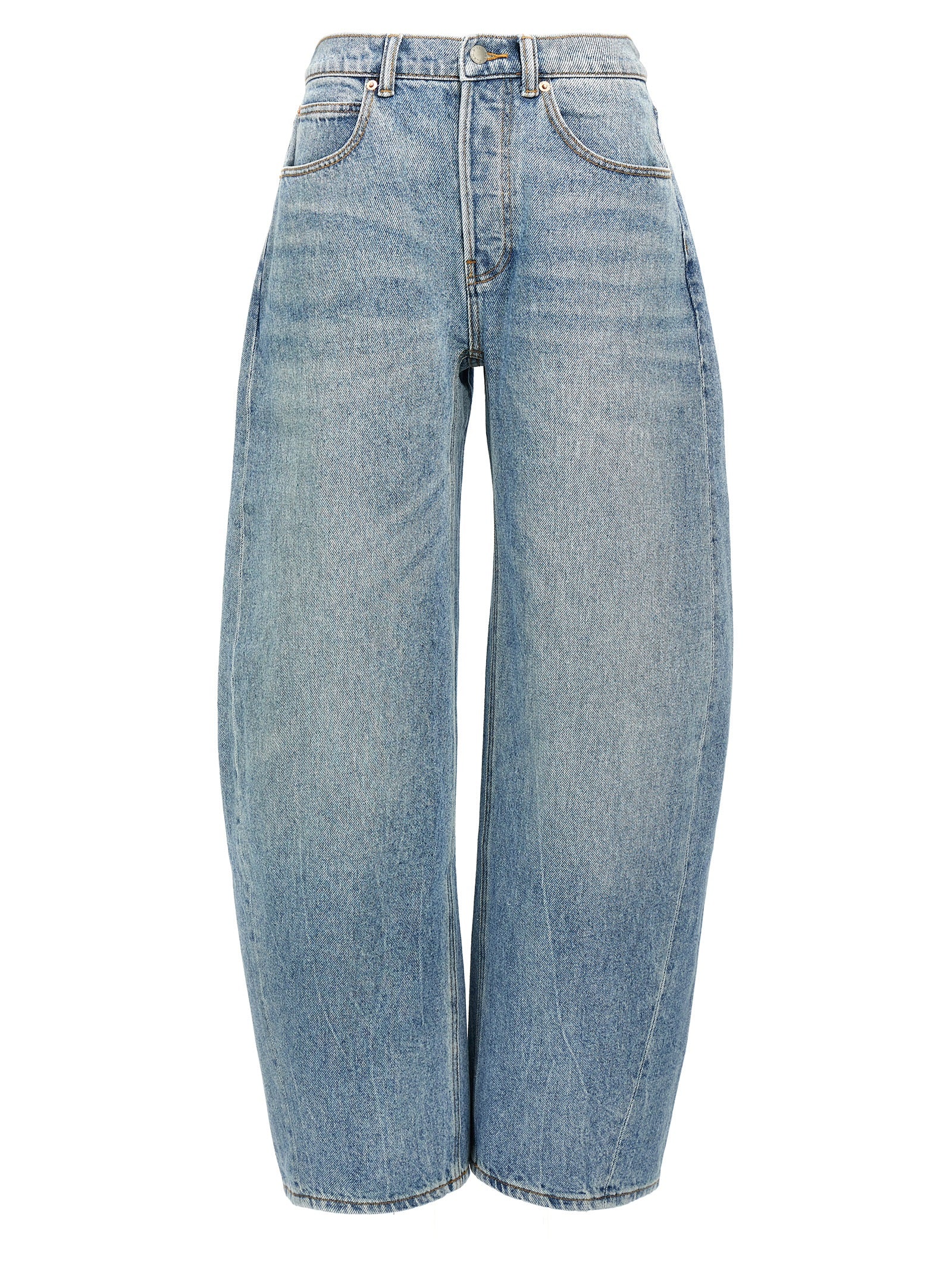 Dżinsy dżinsowe o wysokiej zawartości, wysoko-zaokrąglonych ”jeansy z szeroką i zaokrągloną nogą, pięć kieszeni, zamknięcie guzików, logo z tyłu.