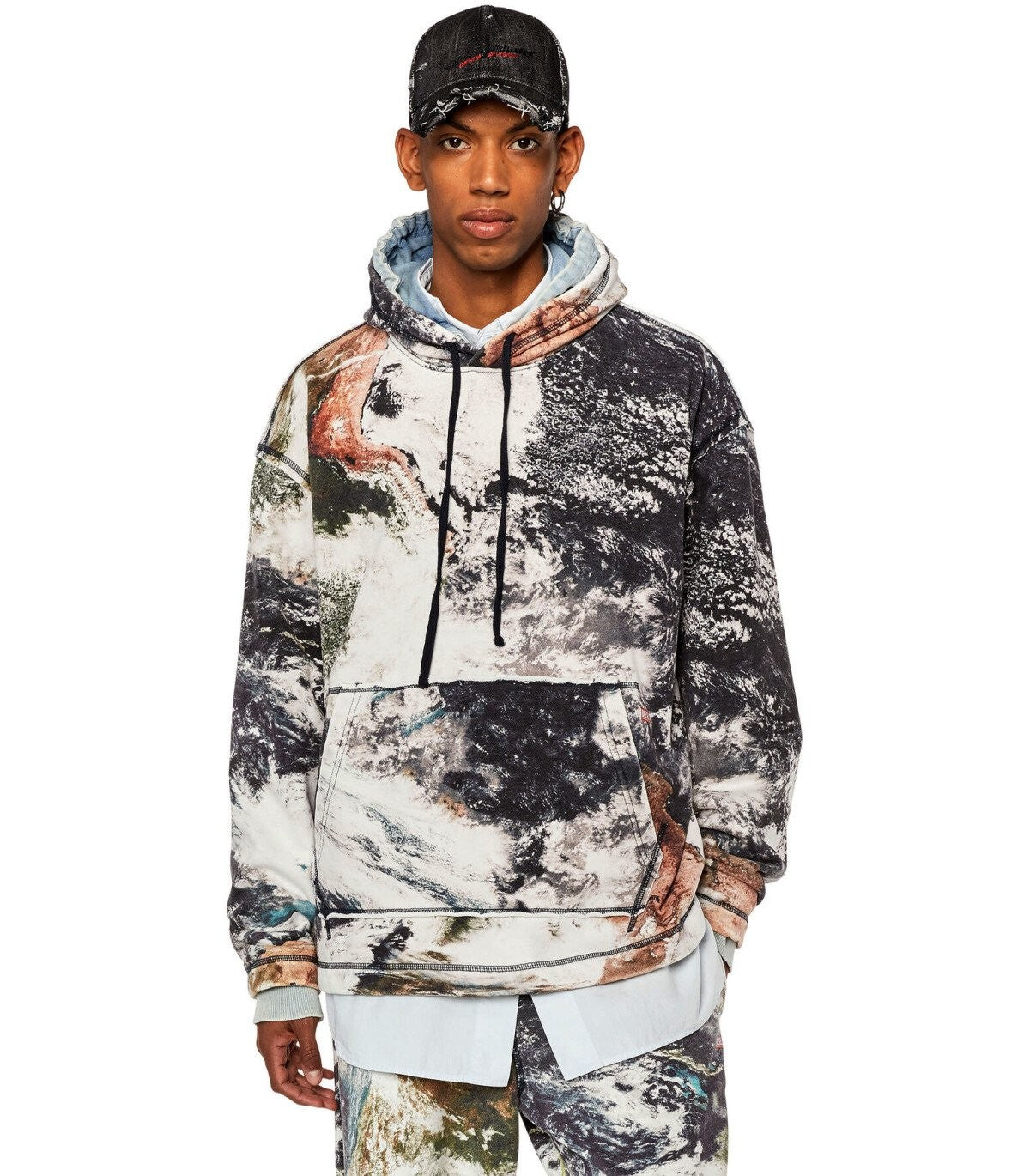 Bluza z kapturem S-Spay-Hood-L1 autorstwa Diesla wykonana z bawełnianej koszulki z wielokolorowym wydrukiem planety. Kieszeń kangura, mini logo z przodu, kaptur i rąbek z sznurkiem. Luźne dopasowanie. Model ma 182 cm wzrostu i ma rozmiar L. Skład: 82% bawełny, 18% poliester.