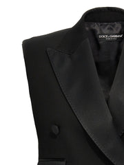Kamizelka smokarska w wełnianej gabardine, satynowe klapy szczytowe, podwójnie wygasły styl z zamknięciem guzików i wyściełanymi ramionami.