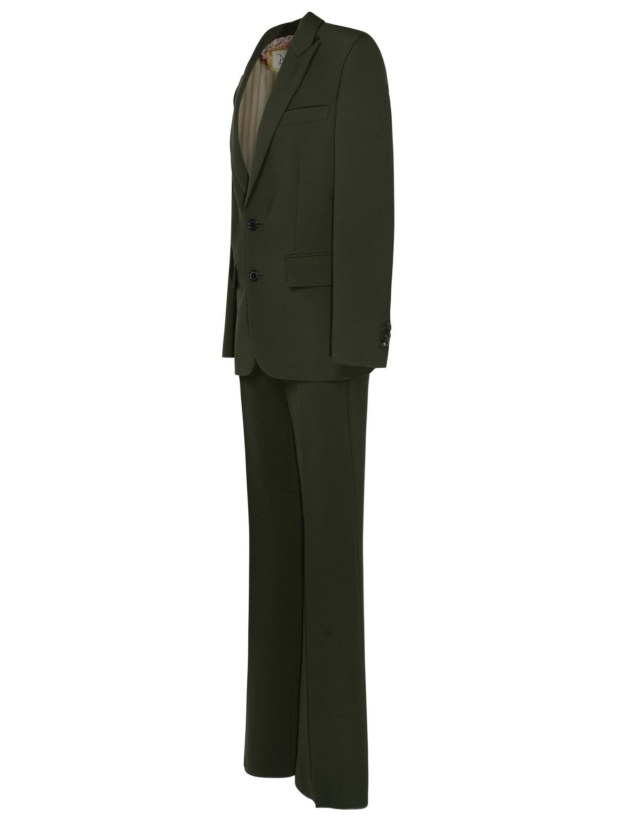 Jednoustronna blezer z szczytowym kołnierzem klapowym, kieszenią na klatkę piersiową, kieszenie klapy z przodu, mankiety guzikowe, tylne szczeliny, spodni z rozciągniętą plisą, pętlą pasa, haczykiem i zadaszonym zamykaniem, francuskie kieszenie po bokach