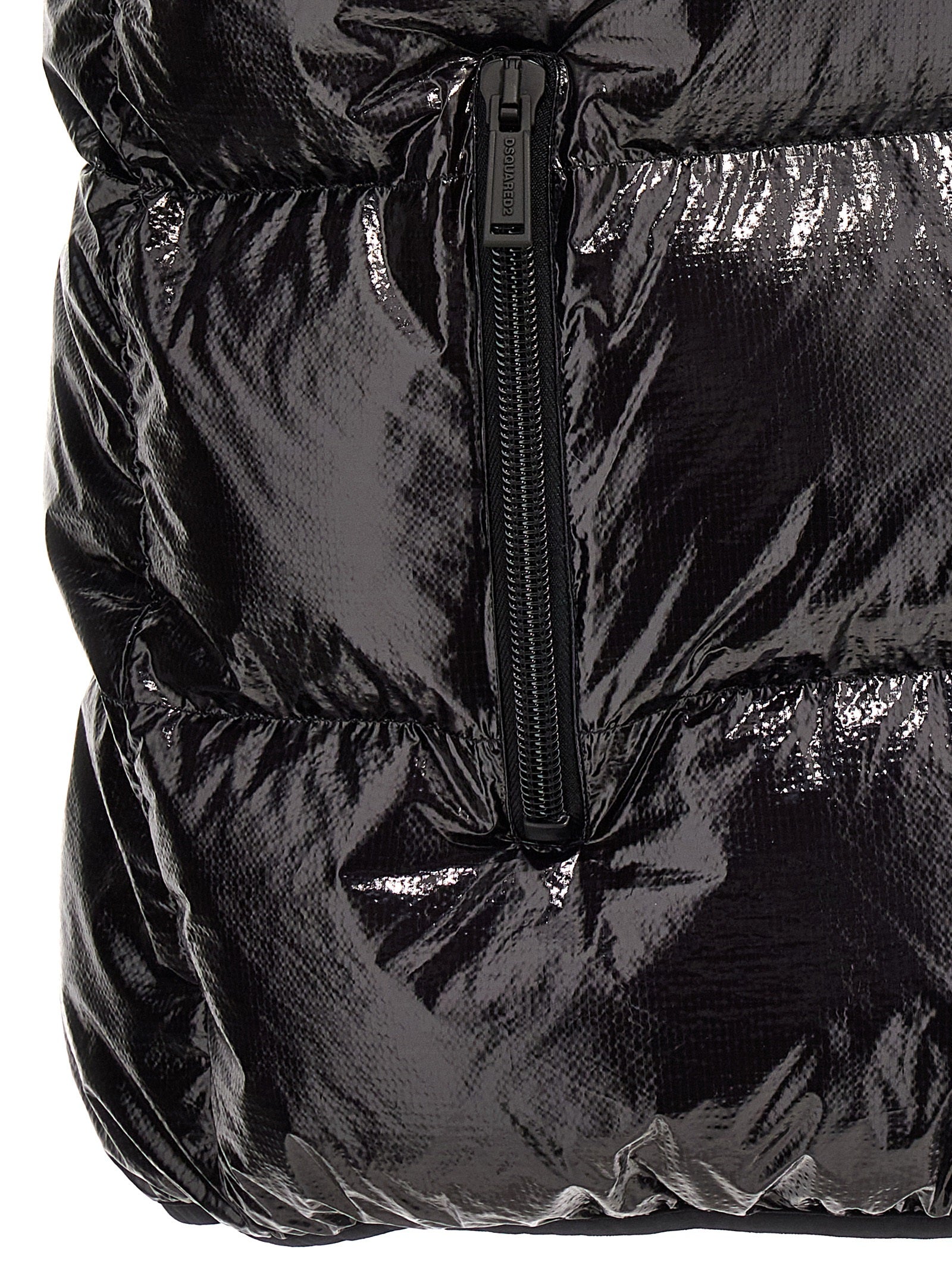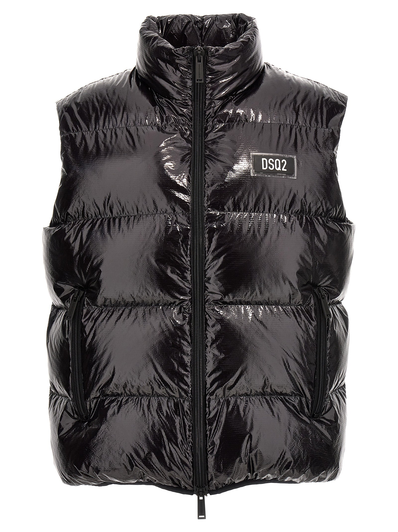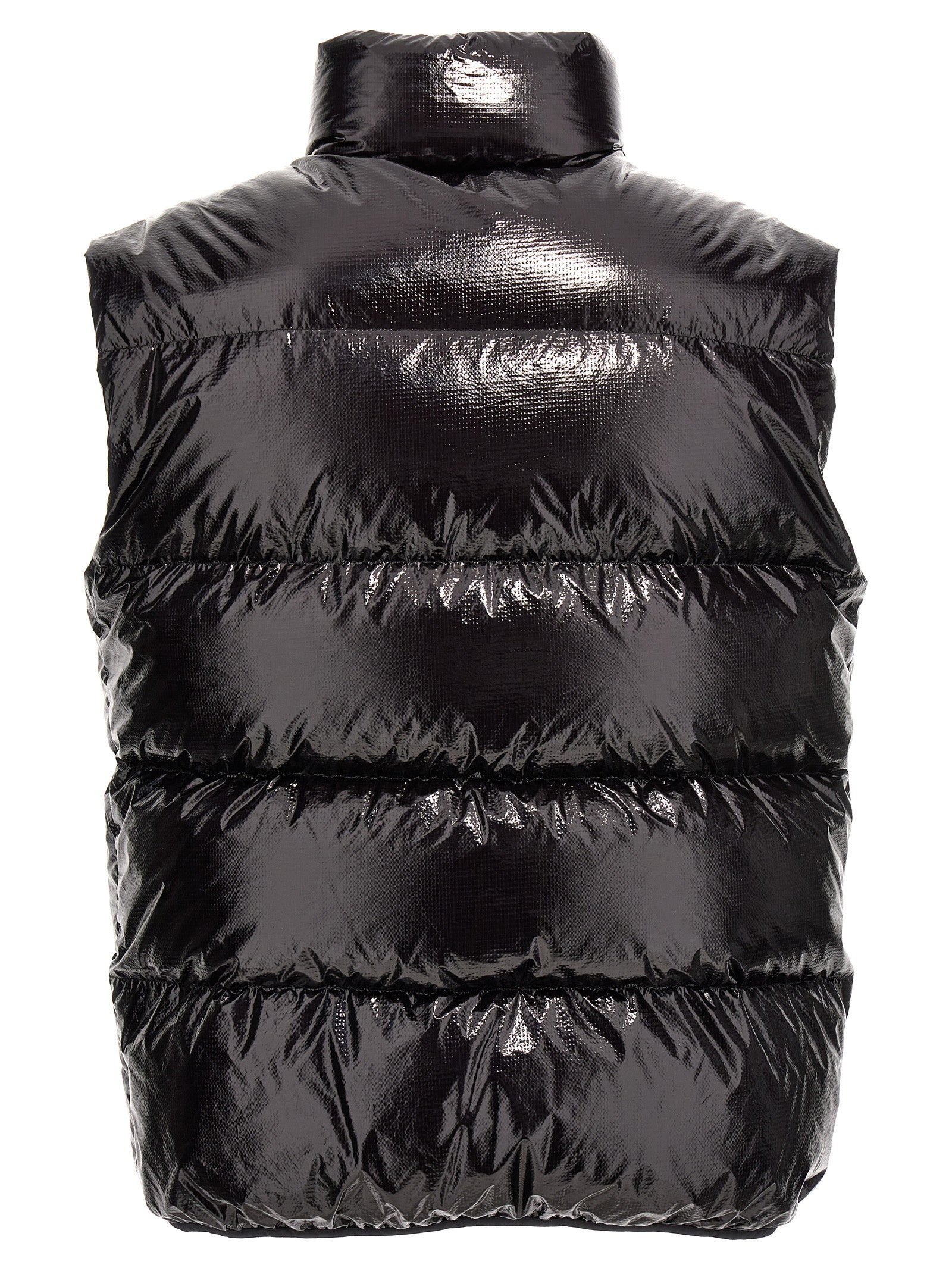 Nylonowa kamizelka z wyściółką, przednią łatką logo, kieszeniami i zamykaniem zamka.