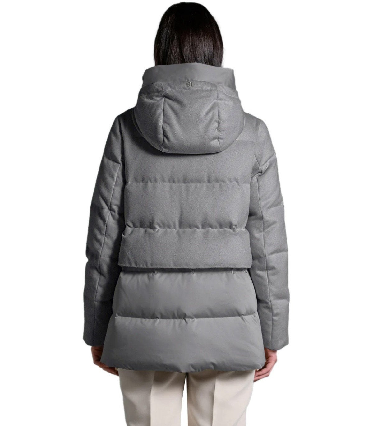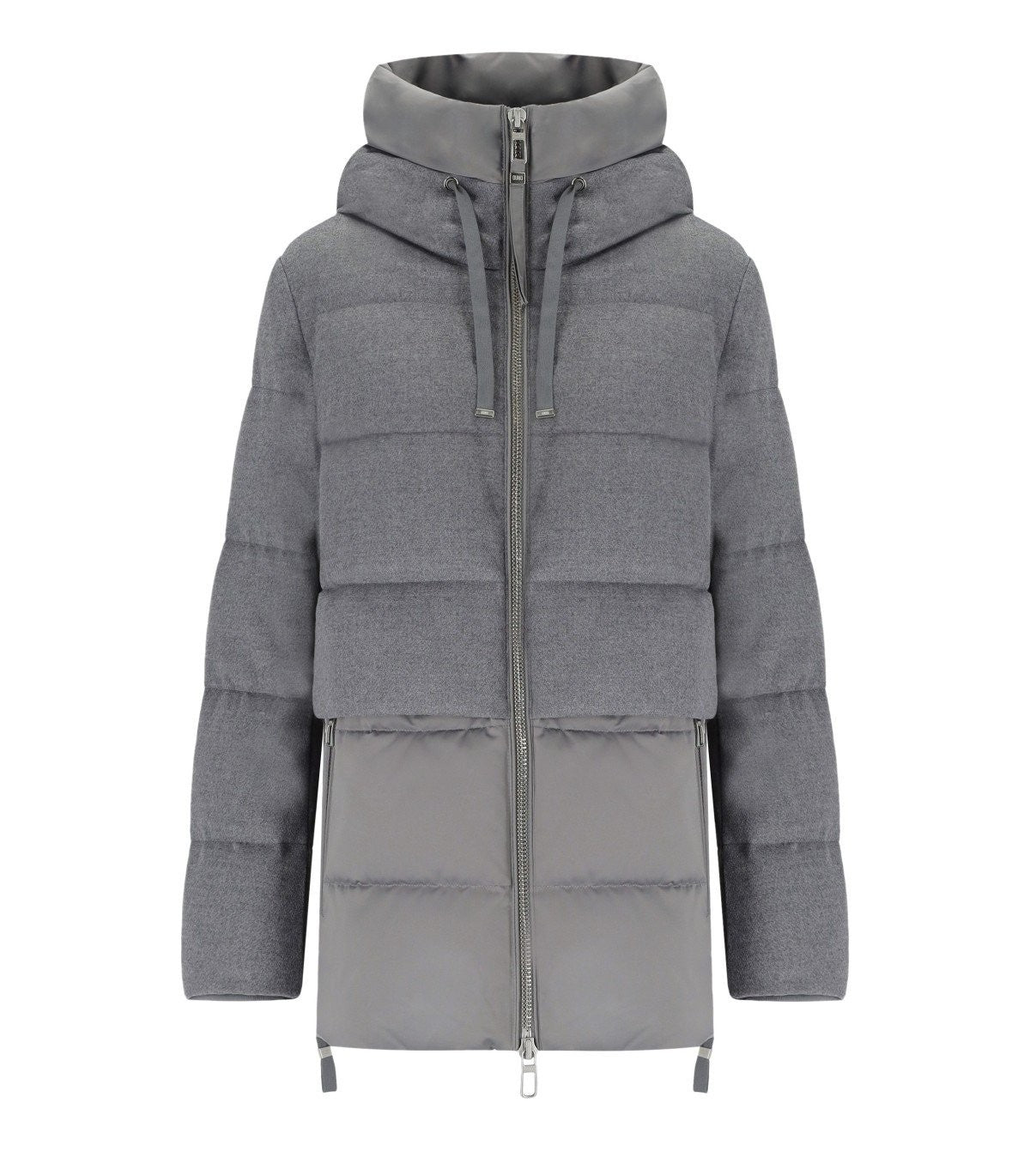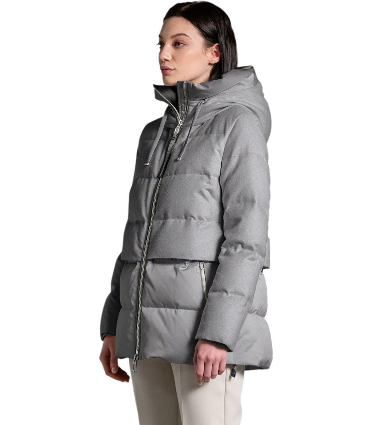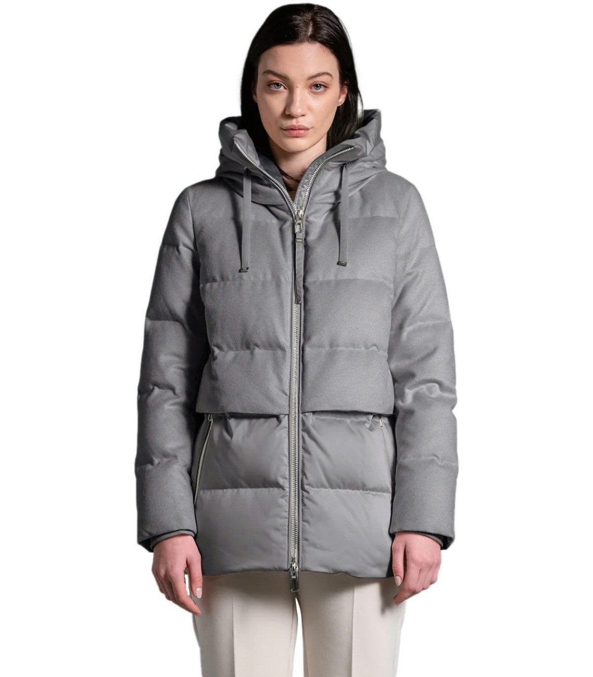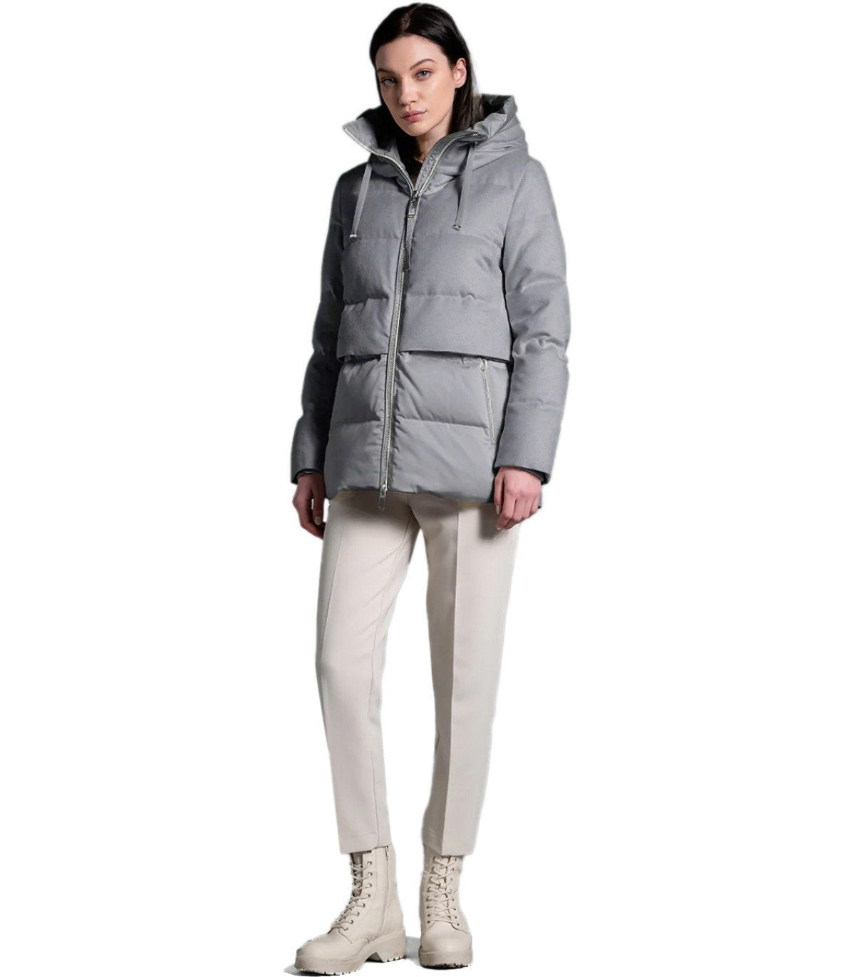 Keiko down jacket by Duno made with a combination of quilted technical wool and satin in gray color. Equipped with padding, it has a large adjustable padded hood with drawstring and long sleeves finished with internal technical knit cuffs. It features a front zip closure with a metal slider and side zip pockets. Adorned with a drawstring at the bottom. Composition of 1st Fabric: 42% Wool 40% Viscose 18% Polyester. Composition of 2nd Fabric: 100% Polyester. Padding: 90% Down 10% Feather.