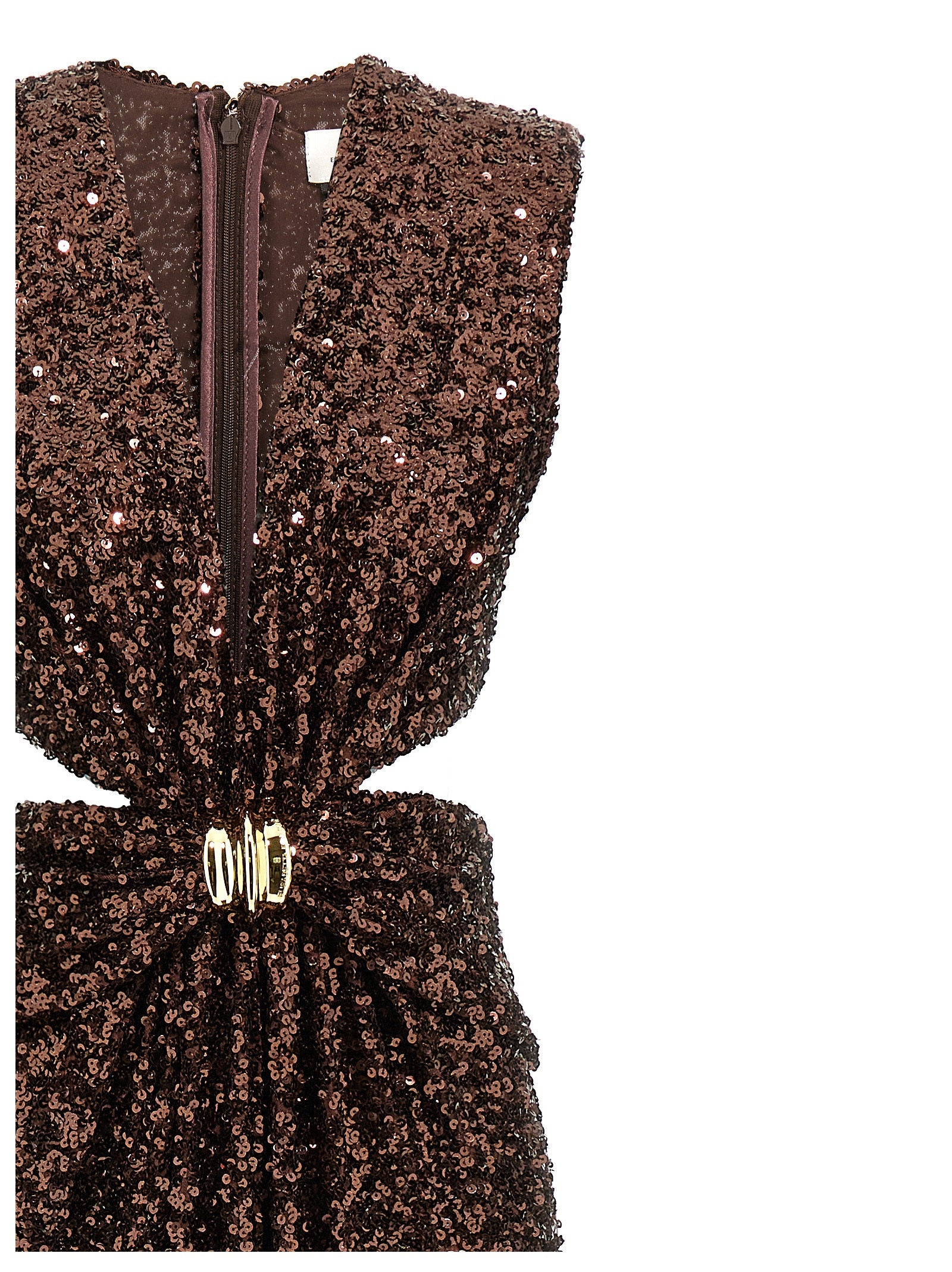 Długa sukienka w lekko rozciągających cekinach, głębokie dekolt w stylu V z metalowymi detalami w talii, wycięte detale z boków, tylne zamek i zamknięcie haczyka.