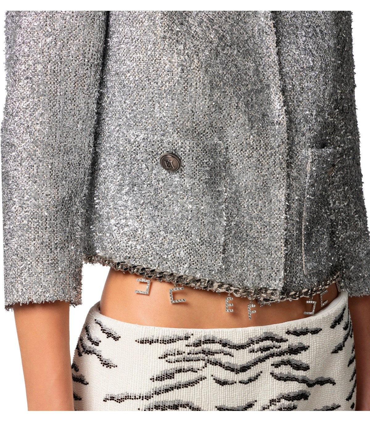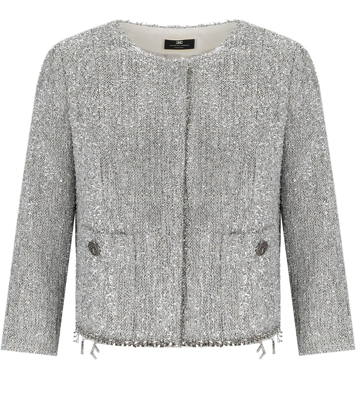 Krótka kurtka Elisabetta franci wykonana ze srebrnego Tweed Lurex. Wyściełane ramiona, satynowa podszewka z wzorem monogramu i przednie kieszenie. 3/4 rękawy, zamknięcie guzików. Model ma 177 cm wzrostu i nosi go w rozmiarze 40. Skład: 52% wiskozy, 30% metalizowanego poliestru, 12% poliestru, 6% bawełny.