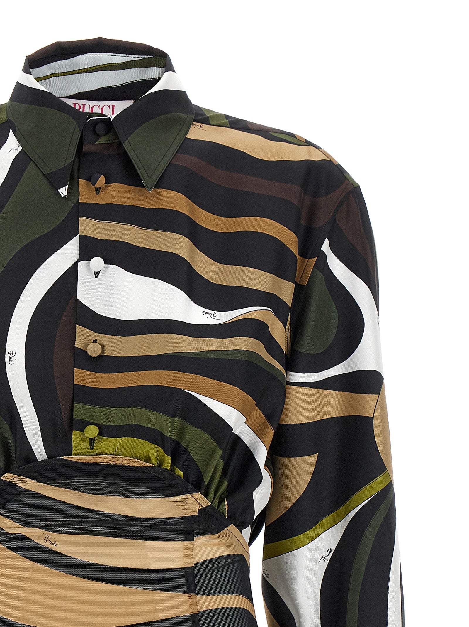 Mini-mini-mini-mini-maryna sukienka składająca się z jedwabnego topu w stylu koszuli, przednim zamknięciem guzików, długich szerokich rękawów z lekko upuszczonymi mankietami i ramionami, półprzezroczystej spódnicy tiulowej na rozciąganie i zamykania bocznego zamka. Ten produkt, podobnie jak wiele innych przedmiotów Pucci, jest wykonany z wszechstronnego wydruku, który inaczej spada na każdej odzieży; Wysłany produkt może różnić się od tego na zdjęciu.
