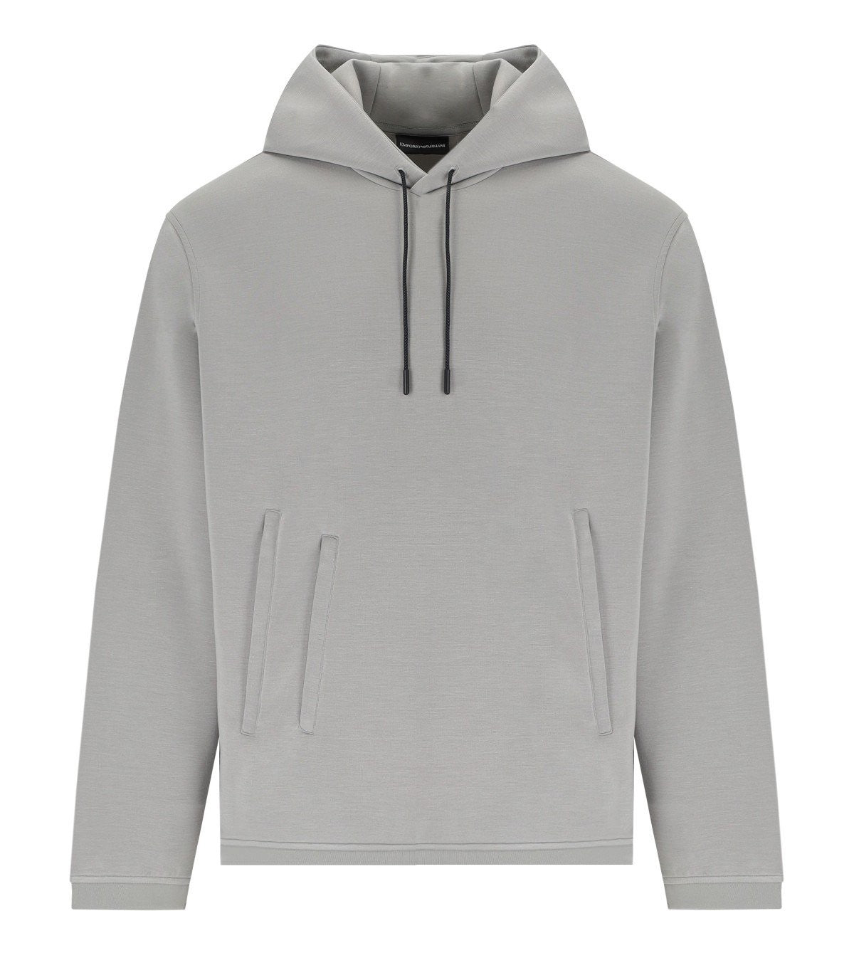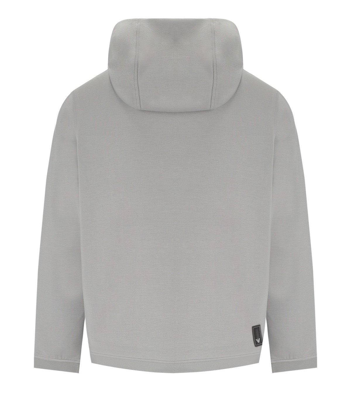 Bluza z kapturem Emporio Armani wykonana z mieszanego materiału modalnego w kolorze szarym. Charakteryzowane przez długie rękawy z żebrowymi mankietami, ma kaptur z regulowanymi sznurkami. Ma dwie kieszenie na zamek błyskawiczne ustawione po przekątnej, a jedna kieszeń zamków z boku. Zrelaksowane dopasowanie. Skład zewnętrzny: 52% poliester, 40% modalny, 8% elastanu. Szczegóły dzianiny: 92% poliestru, 8% elastanu. Podszewka okapa: 52% poliester, 40% modalny, 8% elastanu.