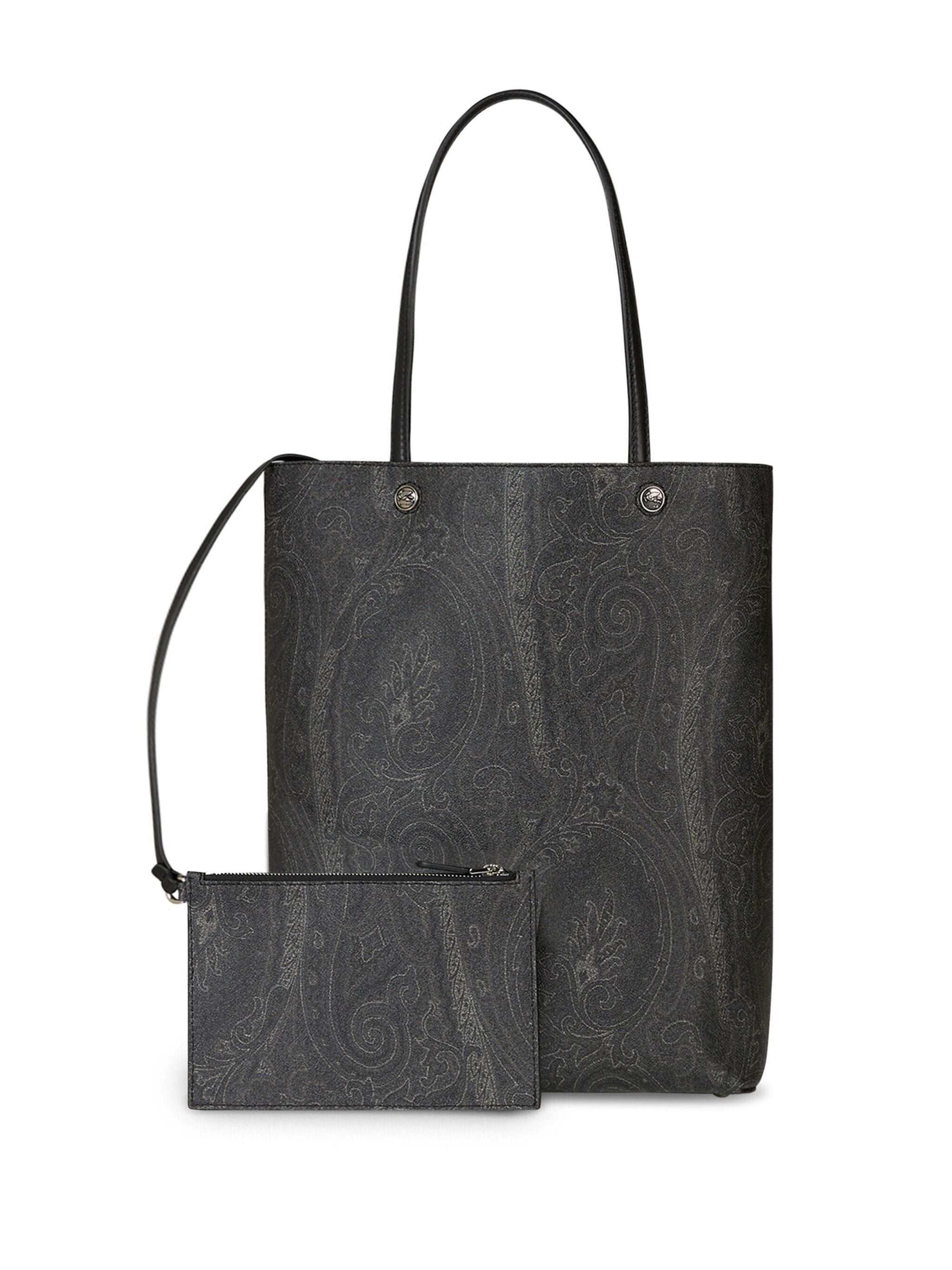 La borsa tote Etro presenta una stampa paisley. Il caratteristico motivo Pegaso arricchisce il design, mentre i due manici lunghi e la chiusura a moschettone garantiscono praticità. Senza fodera, include uno scomparto unico e un pouch rimovibile. Un accessorio elegante e versatile.