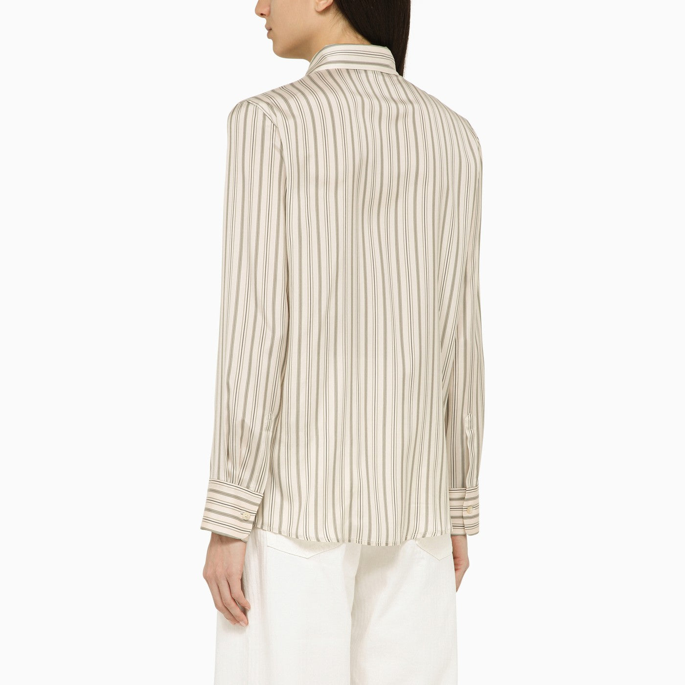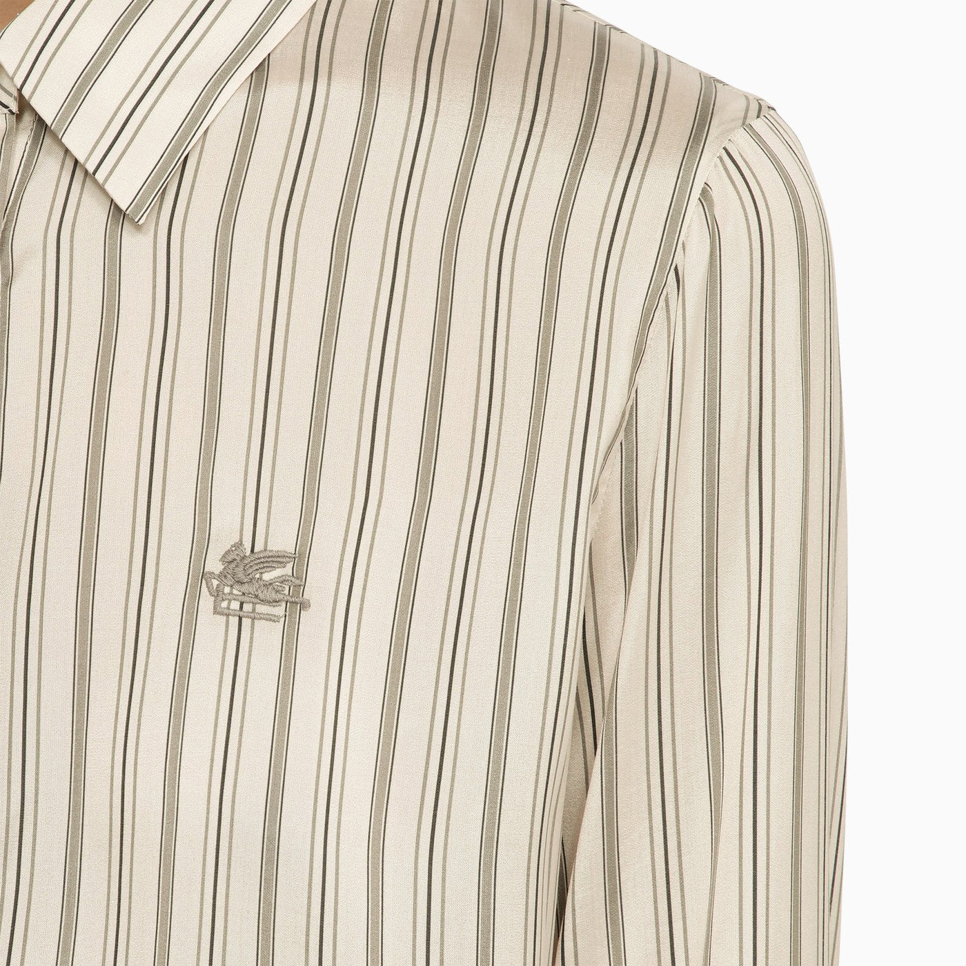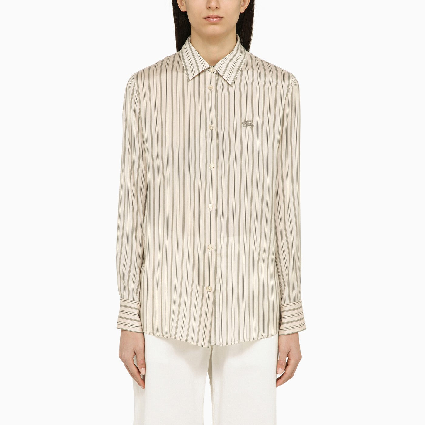 Biała i szara jedwabna koszula z Etro z klasycznym kołnierzem, przednim guzikiem, długimi rękawami, zapinanymi mankietami, haftowanym logo na klatce piersiowej i dopasowaniem Boyfit.