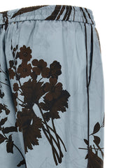 „Doride I” jedwabne spodnie z „XIX -wiecznym nadrukiem Ramage”, elastycznym paskiem i sznurkiem, kieszeniami, prosta noga z rozciągniętym zagięciem.