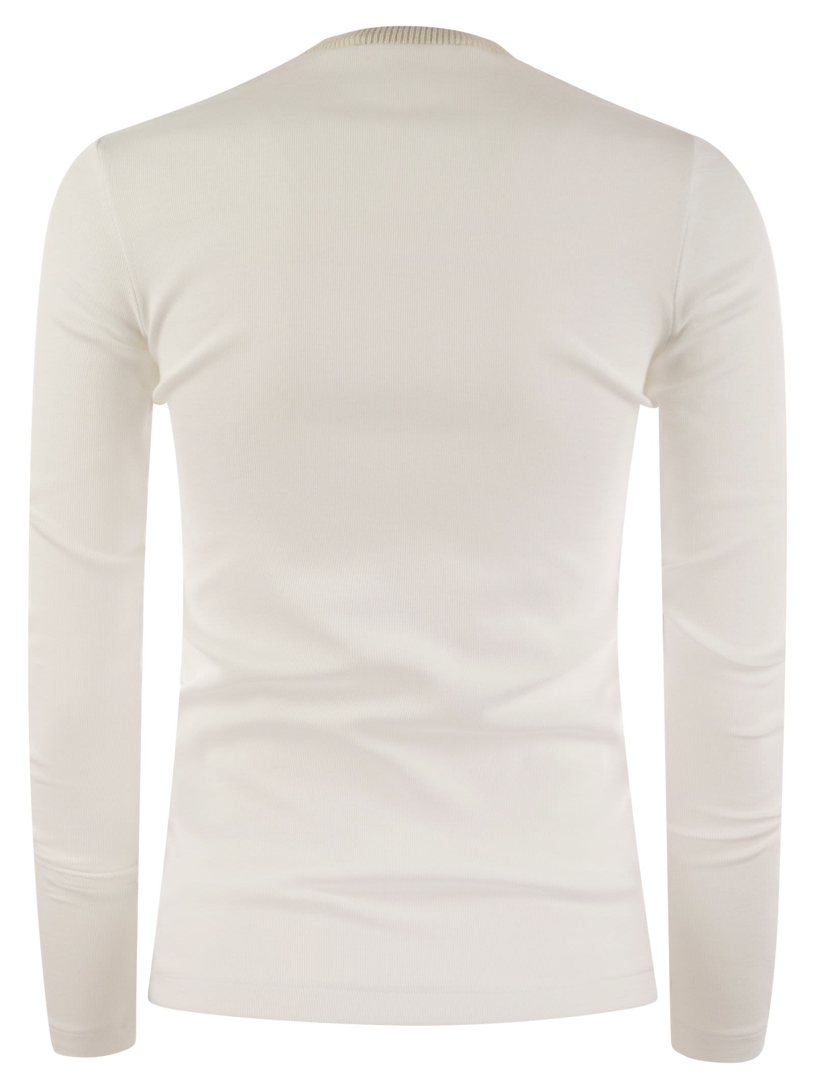 Niezbędna koszulka z długimi rękawami w żebrowej bawełnianej koszulce, wyróżniającej się szyi z dzianiny. - Szczupła linia - żebrowana bawełniana koszulka - Designerka Kołnierza ID: Jed214F399I963 21 21