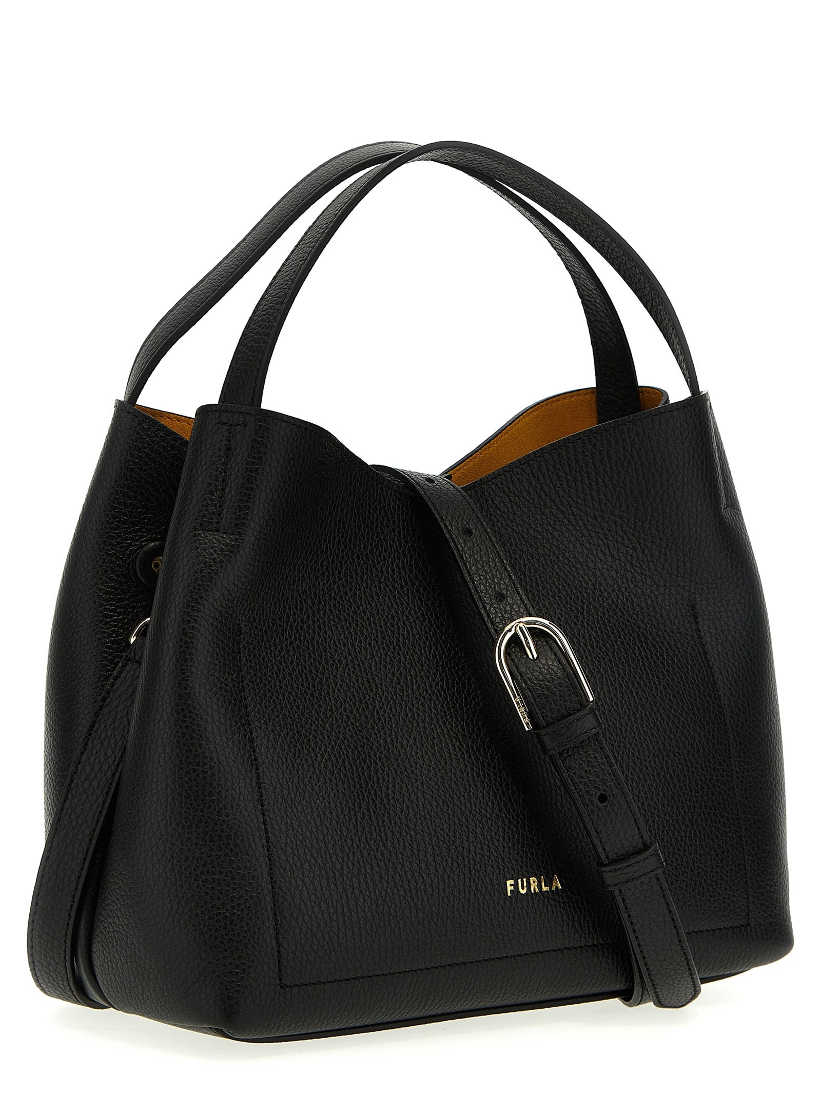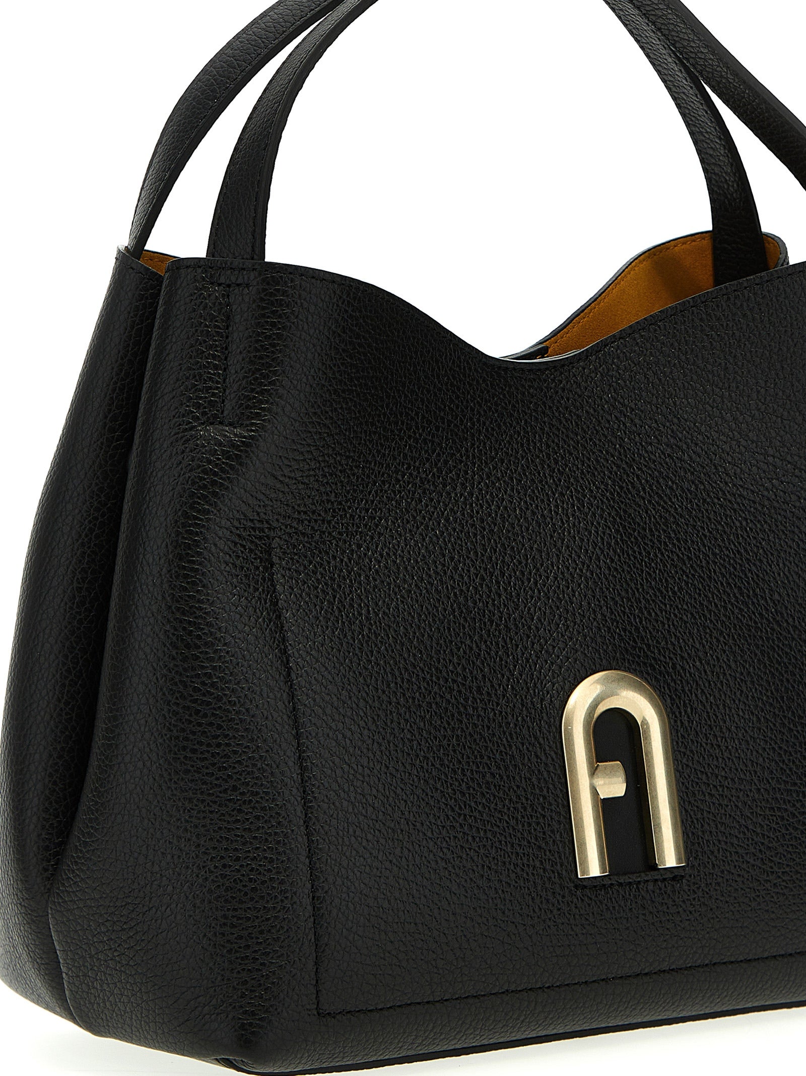Skórzana torebka „Primula S” z metalowym logo, podwójnym uchwytem, regulowanym i wyjmowanym paskiem na ramię.