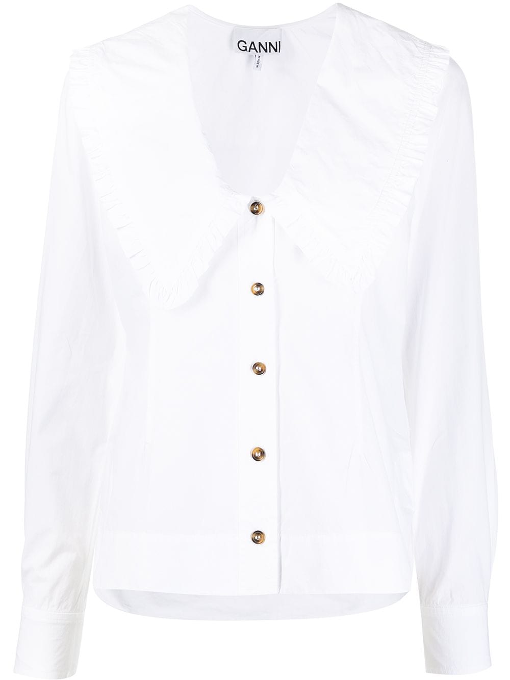 Białe organiczne bawełniane przednie przycisk Zamocanie się Zakrzywione obszycie Bez boku rękawy z kopaniem w mantażu Pozytywnie świadome: Ganni mierzy ślad węglowy każdego przedmiotu, a na każdym znajdziesz etykietę kompensowaną klimatem, co pokazuje, że pokryły koszty, aby ten ślad węglowy węglowy neutralny.