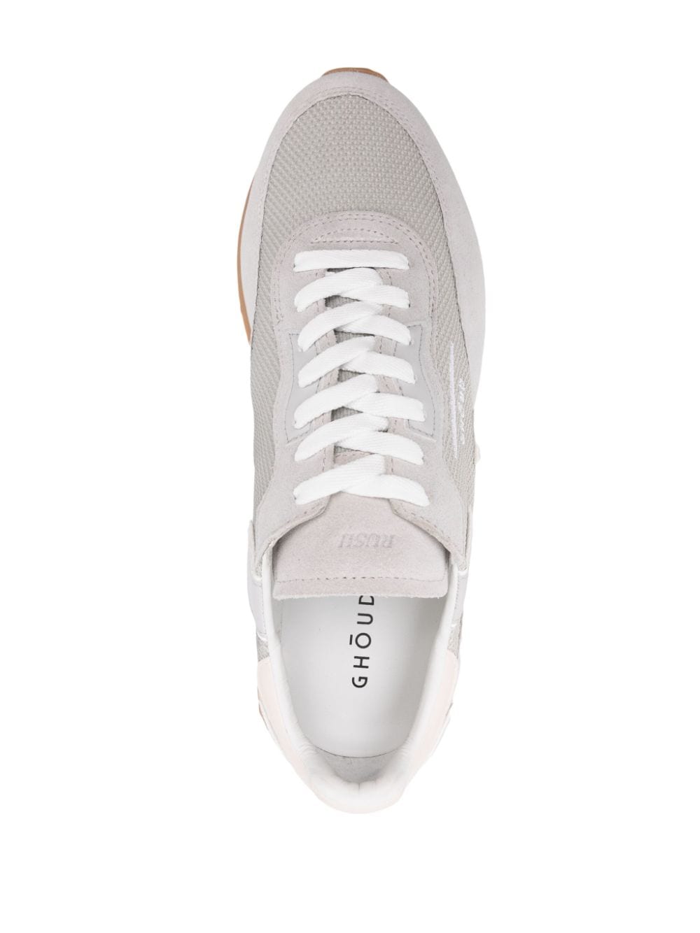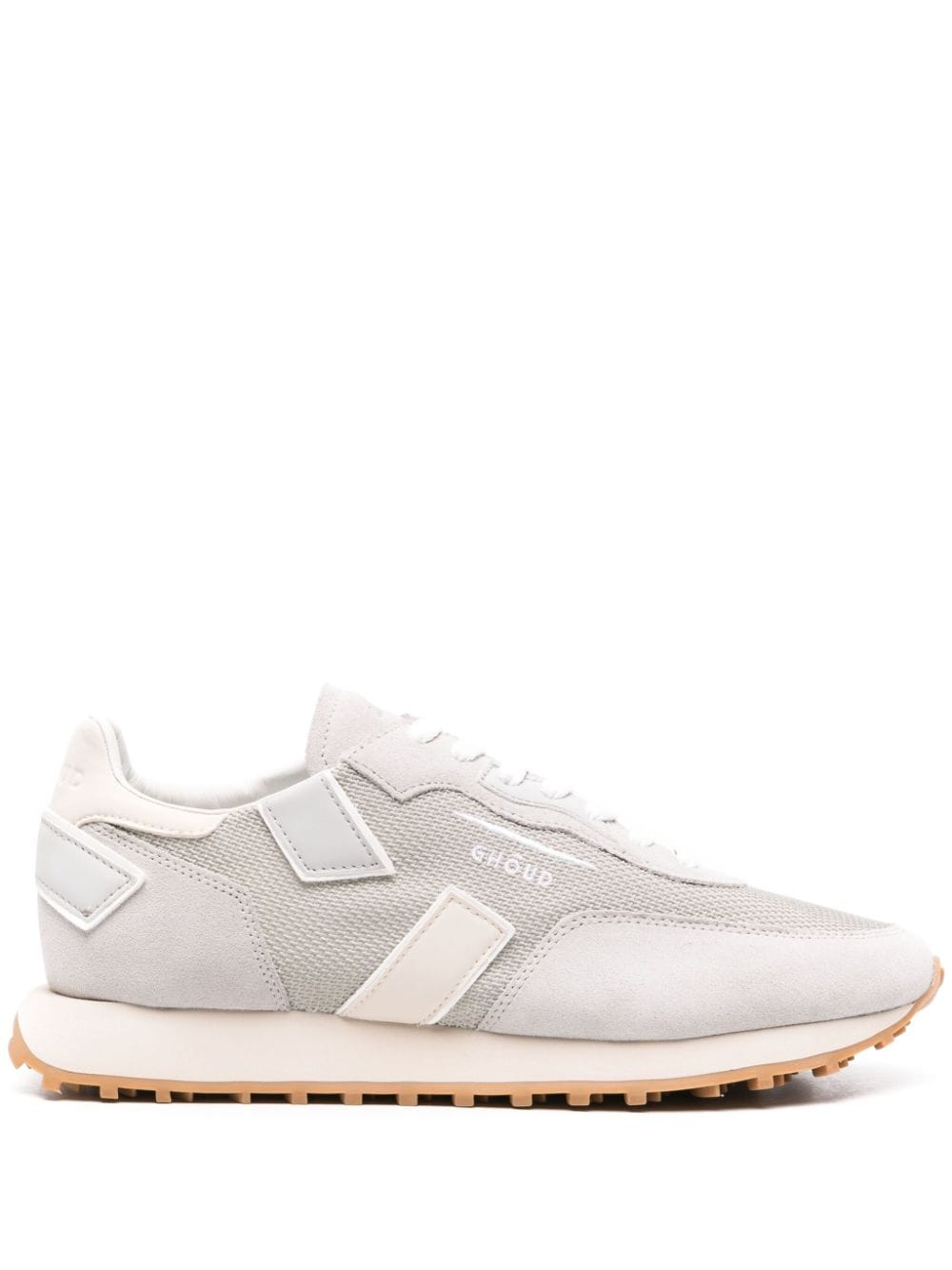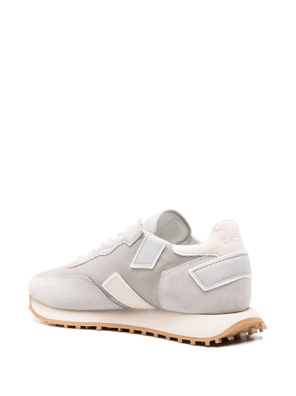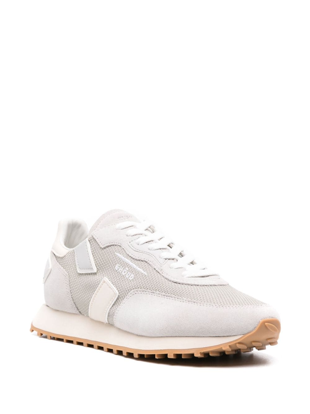 jasnoszary/lekki beżowy/biały przeplatany design design design zamszowe i skórzane panele haftowane logo do bocznego marki pięty okrągłe palec palec przednie koronkowe mocowanie francuskiej podszewki francuskiej marki skórzana wkładka gruba gumowa podeszwa