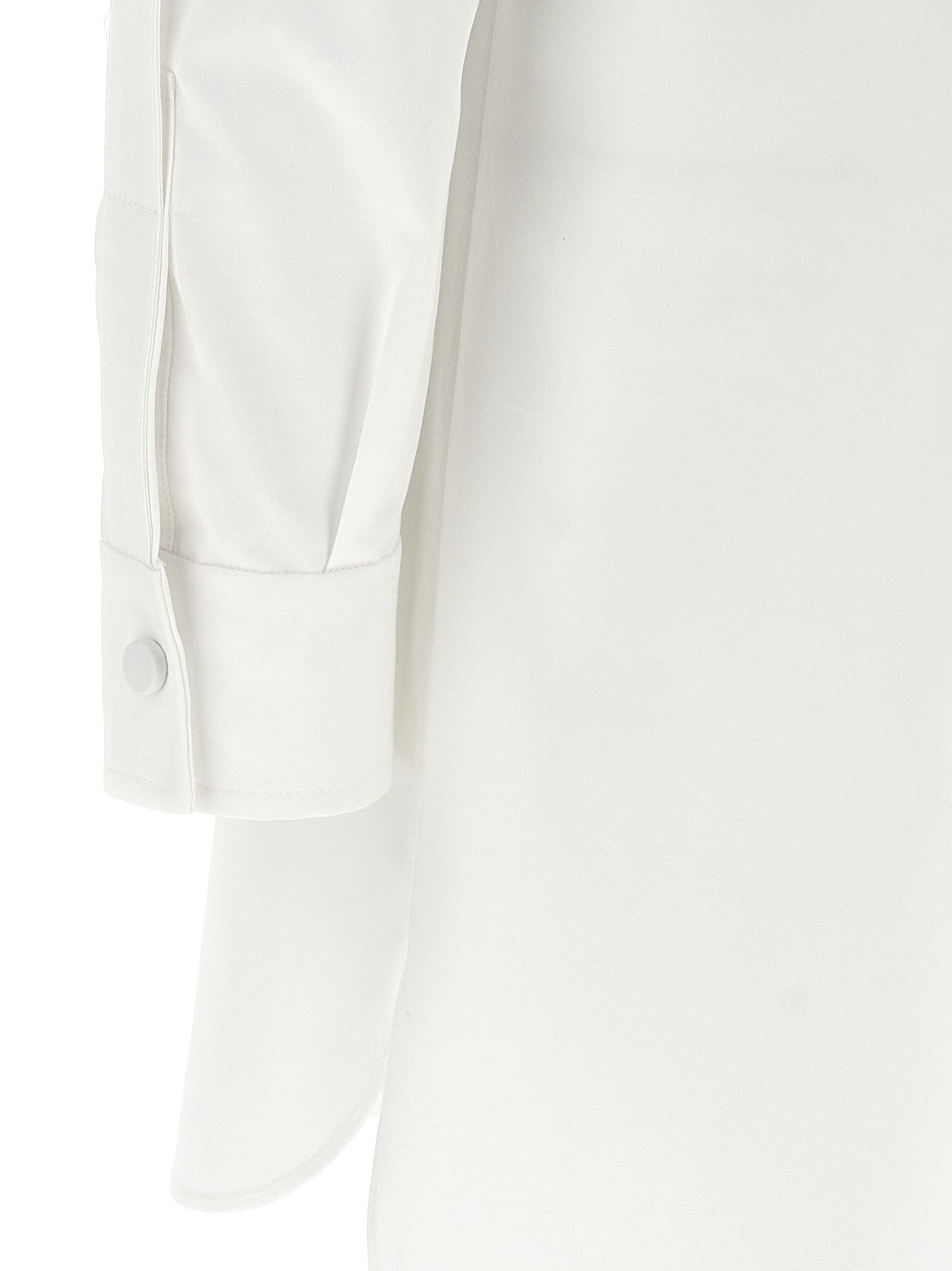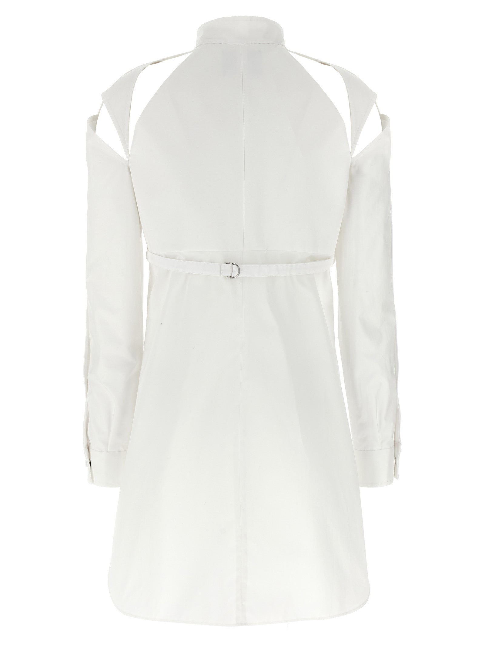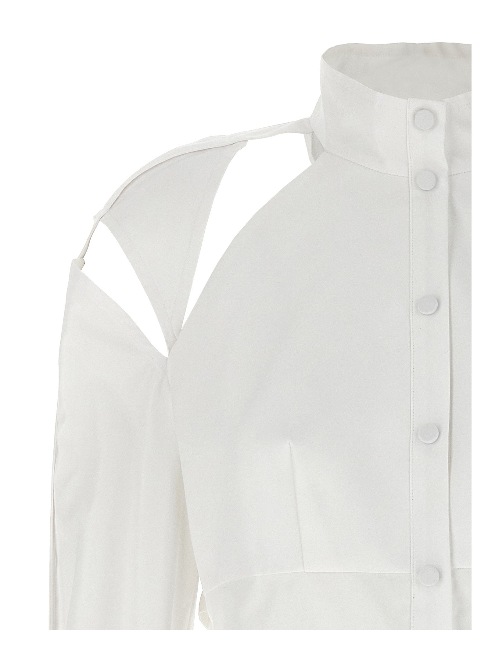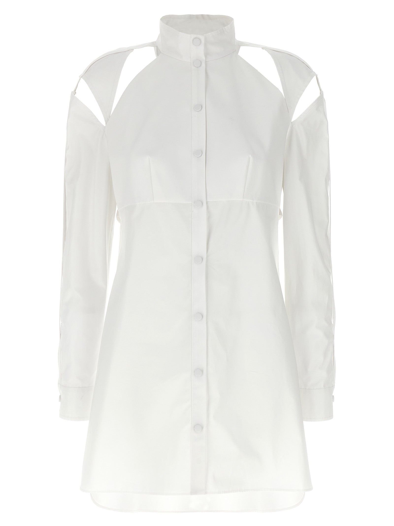 Sukienka bawełniana mini chemisier, wycięcie detali na ramionach, wysoka szyja, zamknięcie guzika, długie rękawy mankietowe, regulowane aplikacje pasowe.