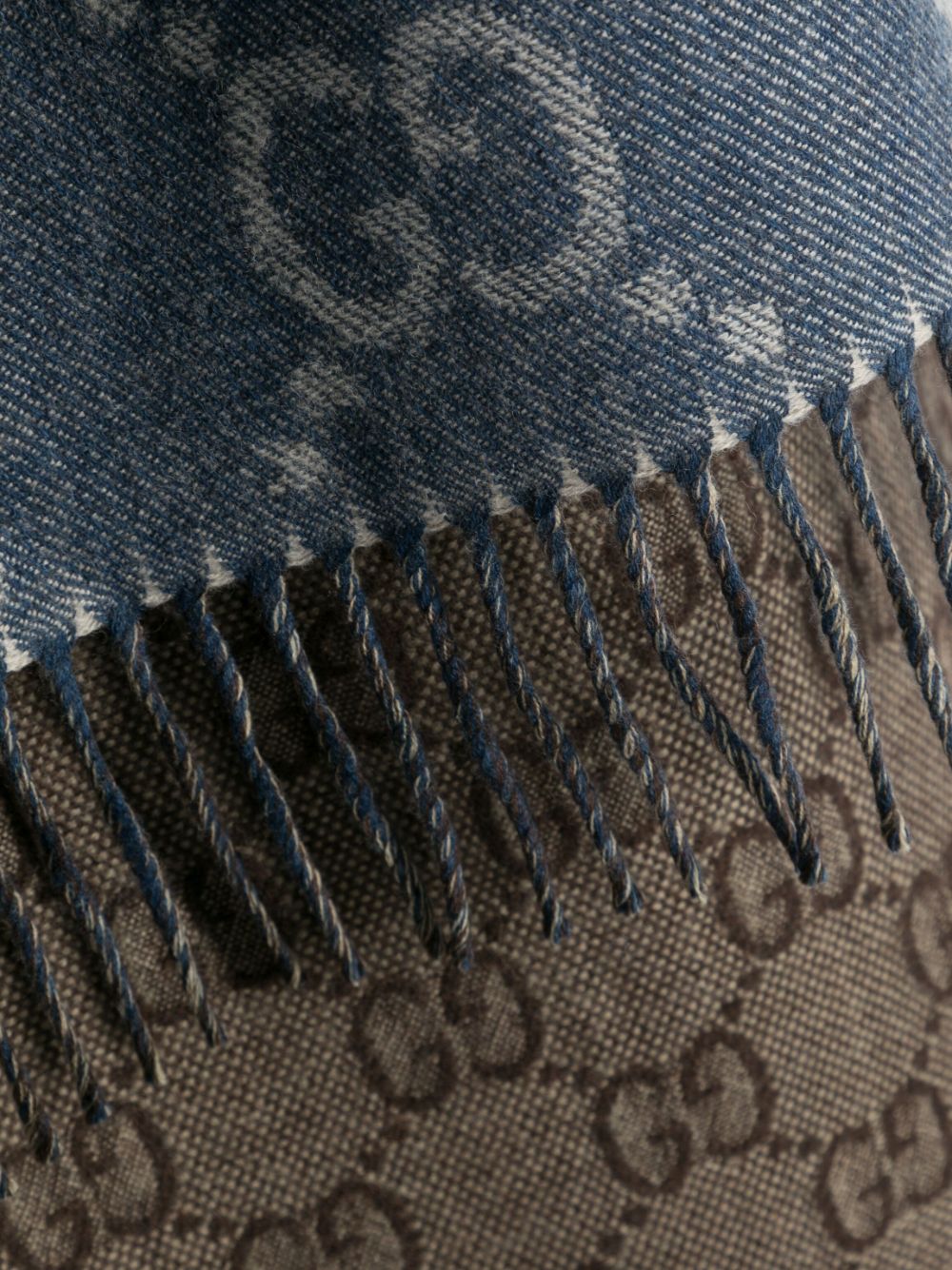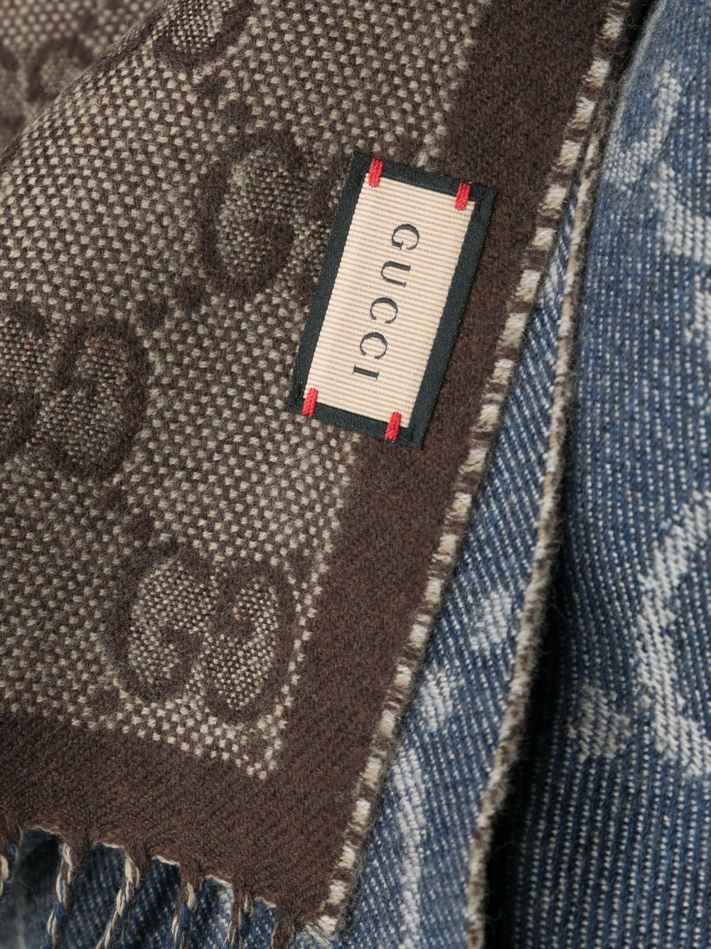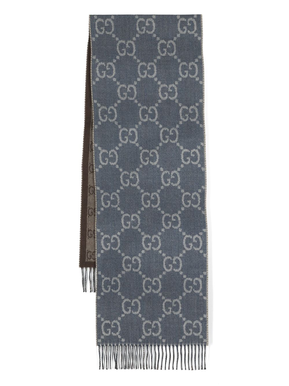 GG Damier-Jacquard Knit Wool Scali z Gucci z granatową, wełnianą, dzianinową konstrukcją, charakterystyczną GG Damier Jacquard i frędzlą krawędź.
