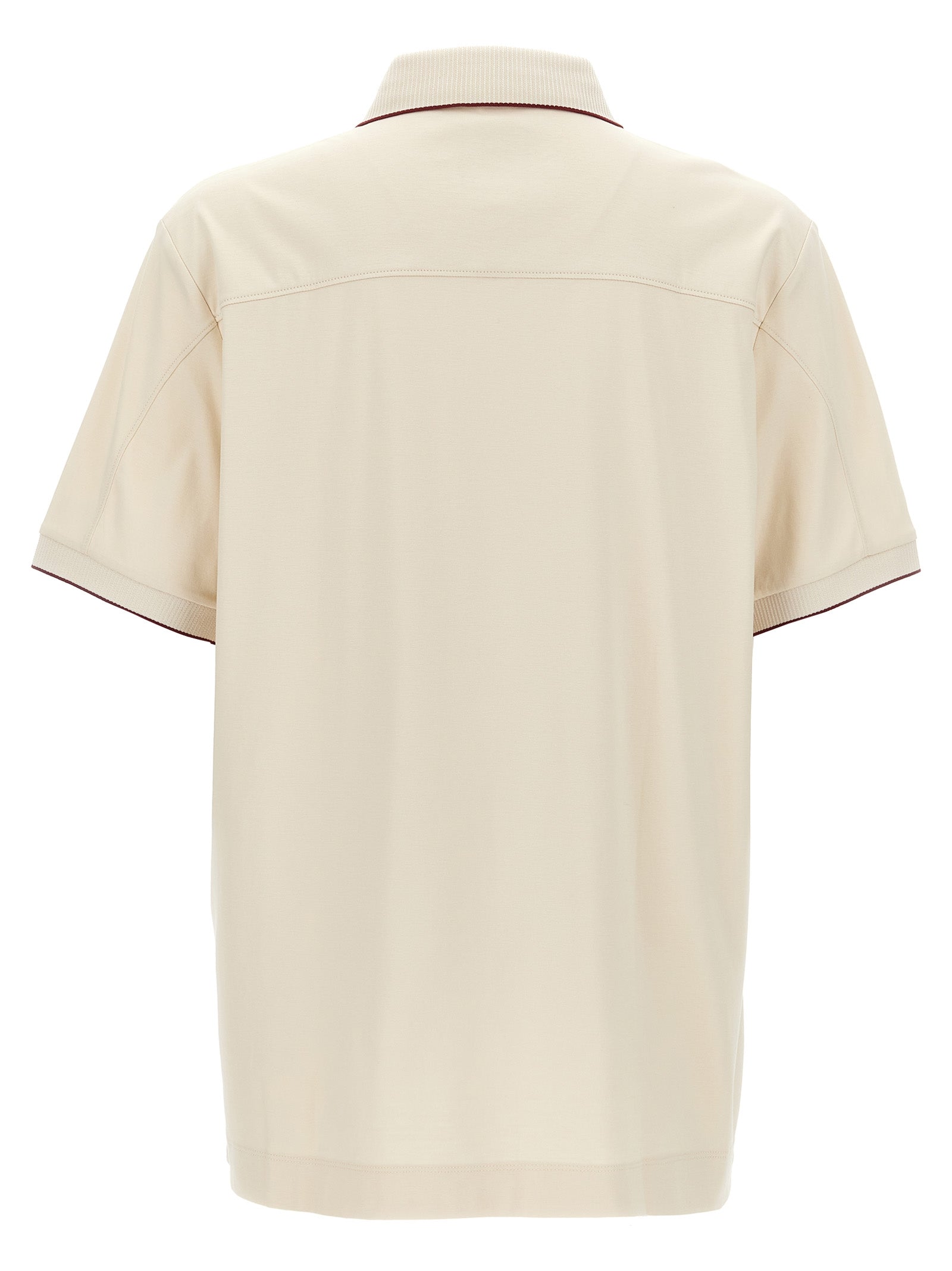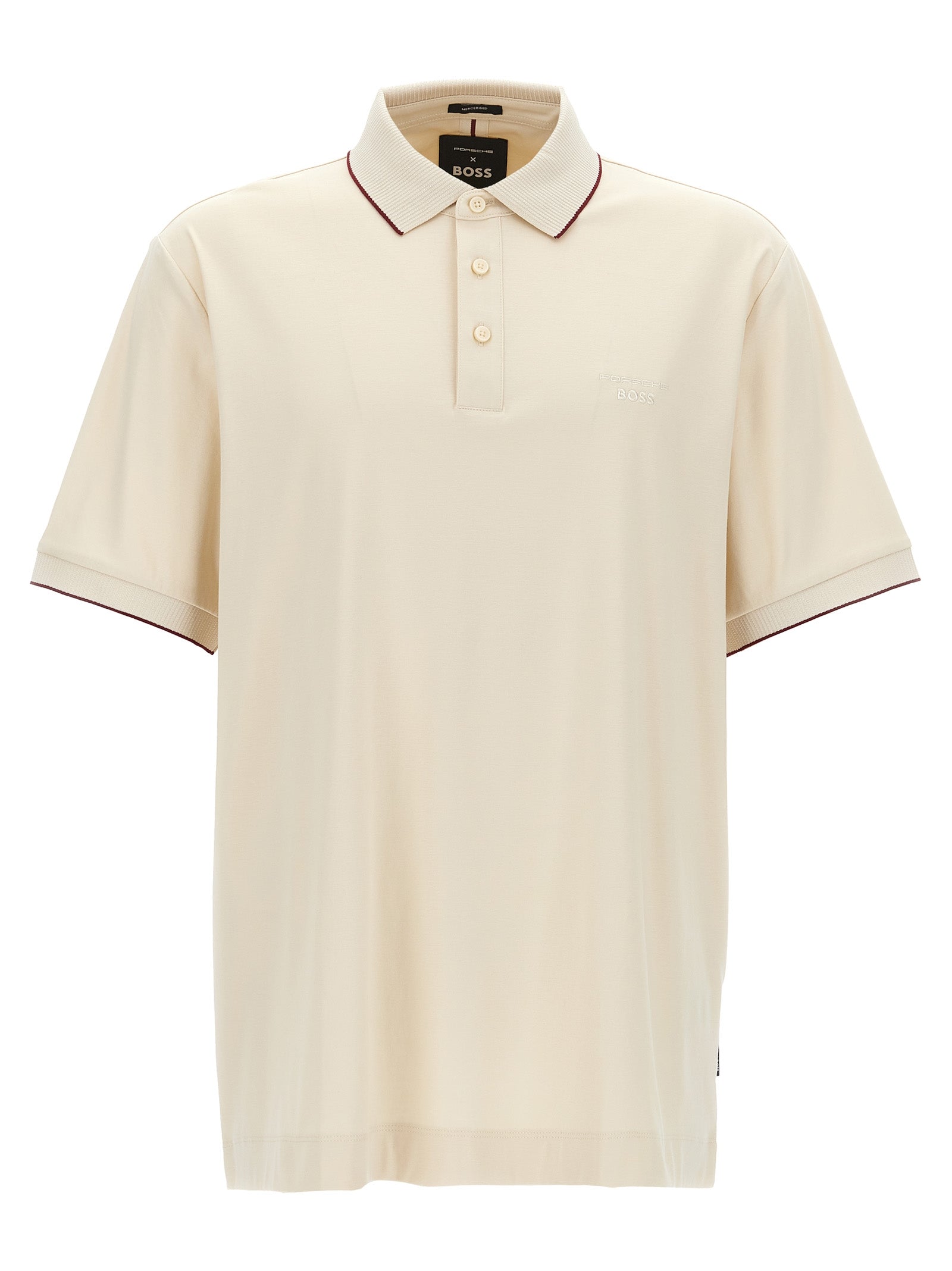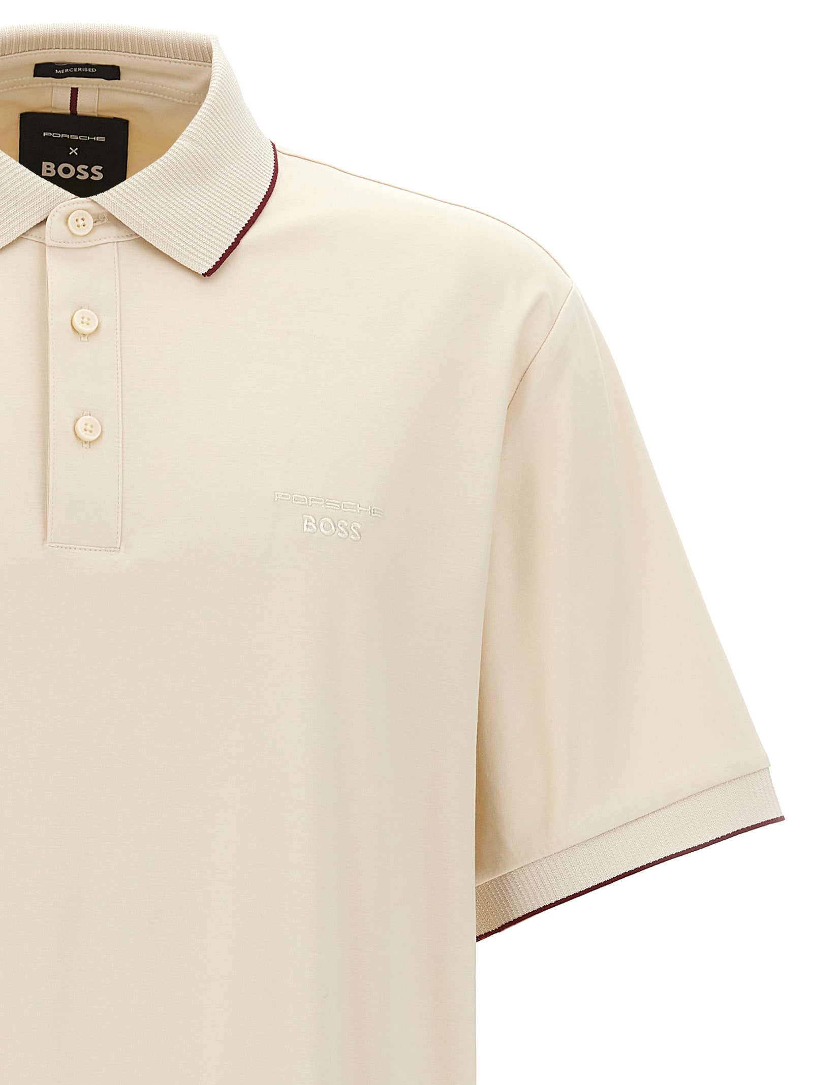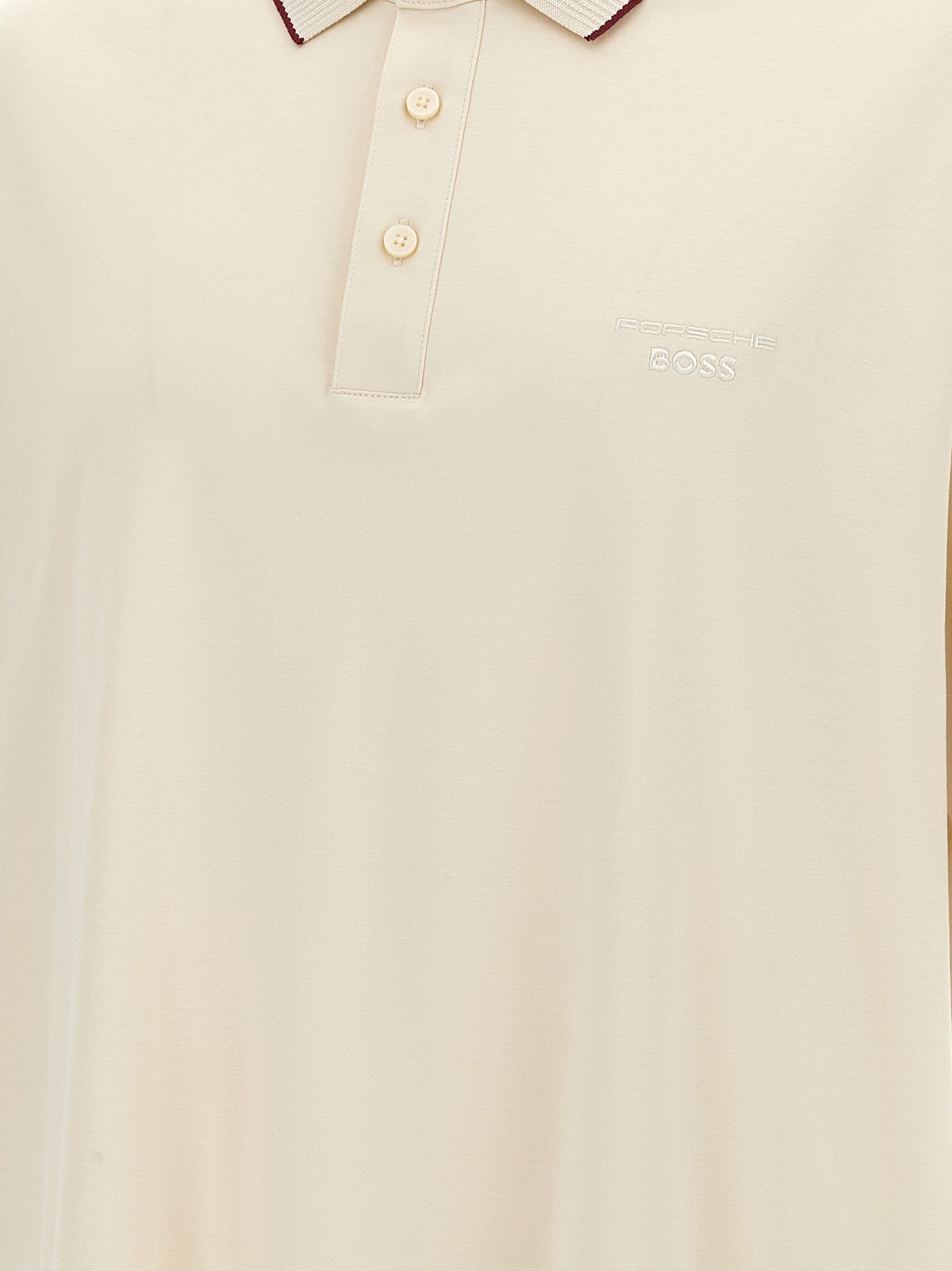 Porsche x BOSS capsule 'Prout 400' polo shirt in mercerized cotton with front logo embroidery, ribbed collar and buttons, short sleeves, and contrasting piping on the collar and sleeves.