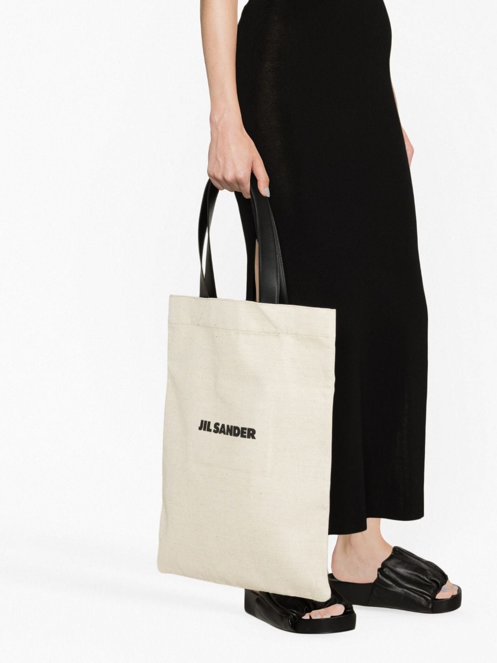 Torba na płótnie z logo z Jil Sander z neutralną/czarną mieszanką, bawełnianą mieszanką, skórę cielęcką, dwa górne uchwyty, druk logo z przodu i główny przedział.