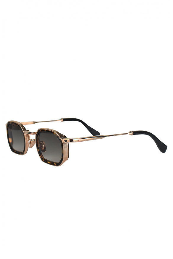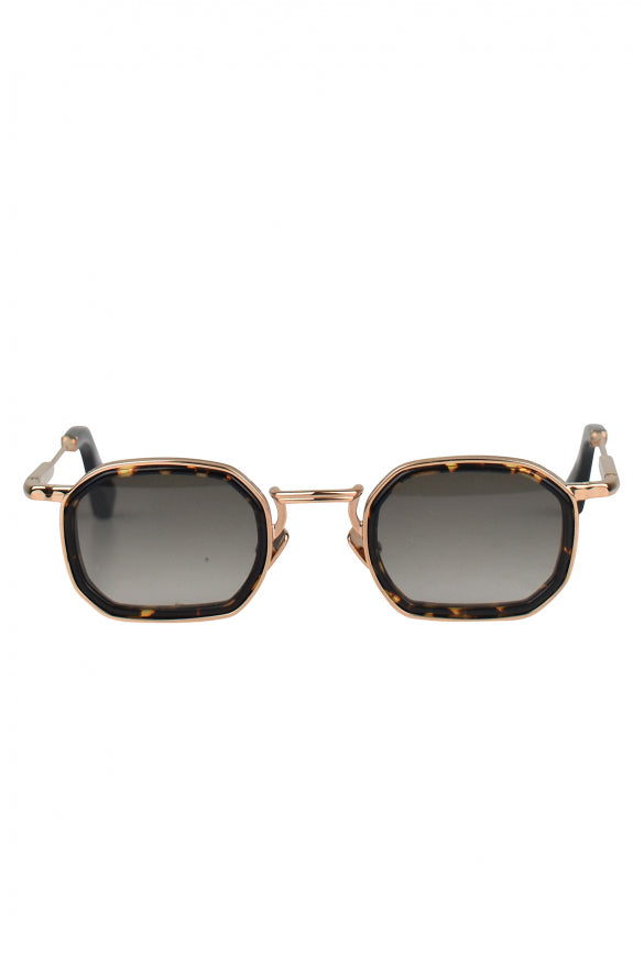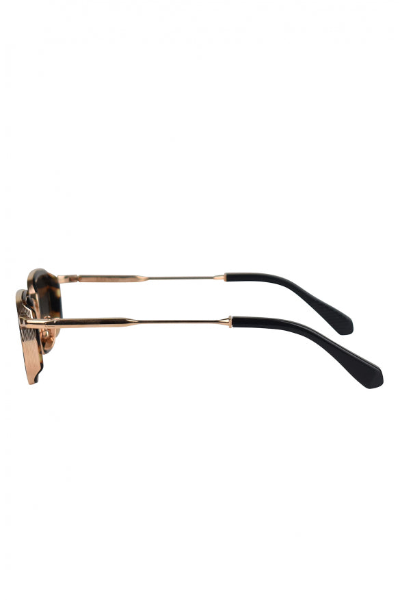 Kwadratowa rama w złotym metalu i octanie hawany wokół soczewek.