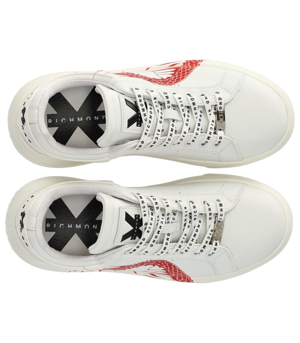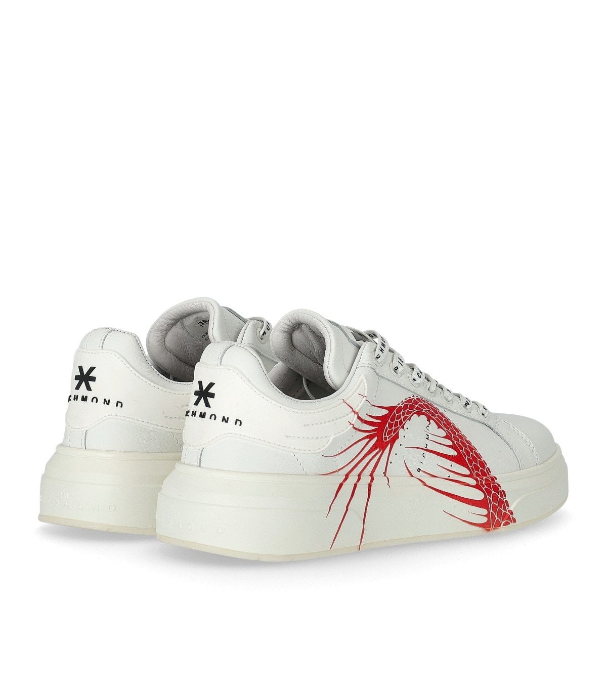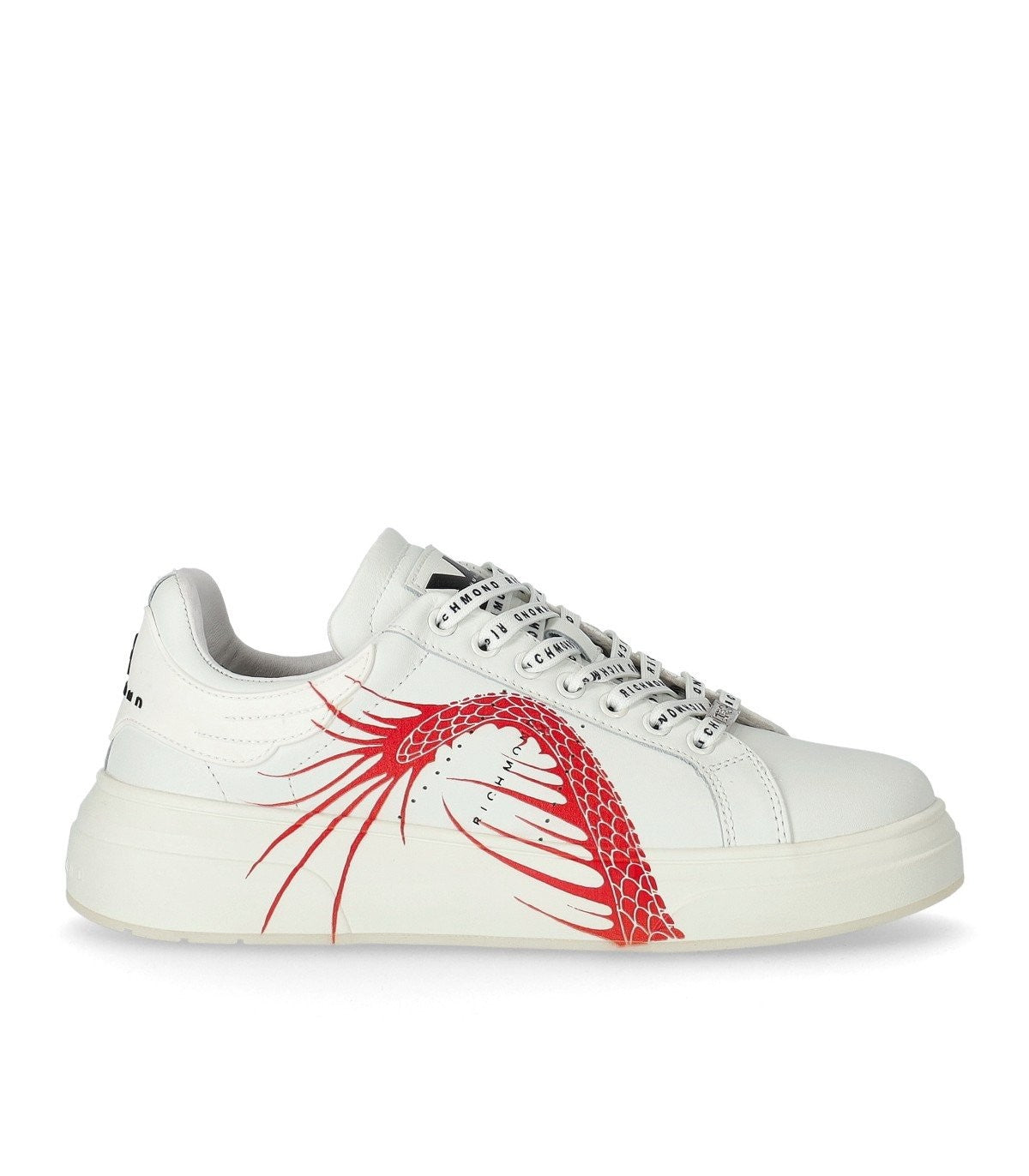 Dragon Sneaker Johna Richmonda w białej skórze z czerwonym smokiem z boku. Logo na języku iz powrotem. Wewnętrzne i wyjmowane wkładka ze skóry. Gumowa podeszwa, wysokość 4,5 cm. Wkładka i wnętrze ze skóry.
