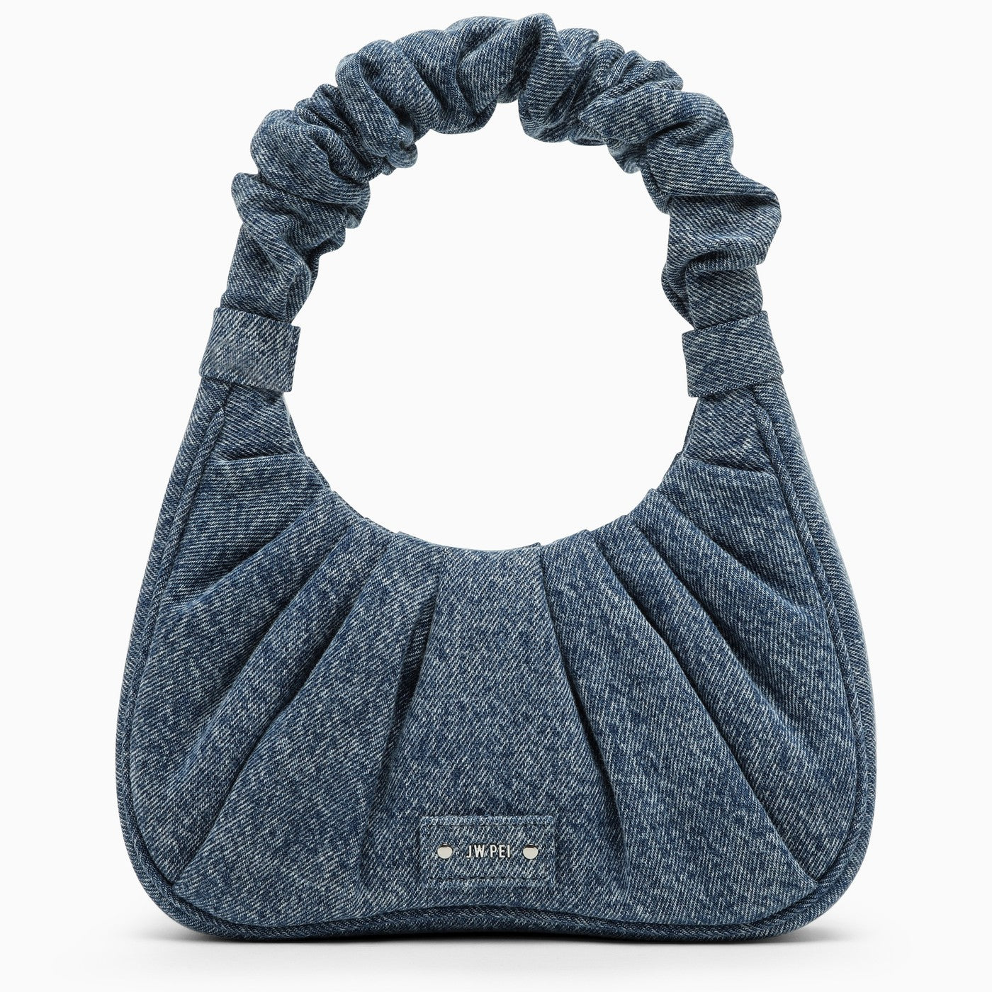 Blue Denim Hobo torebka z JW PEI zawierającego magnetyczne mocowanie guzików, marszczony uchwyt, wewnętrzną płaską kieszeń i logo z przodu.