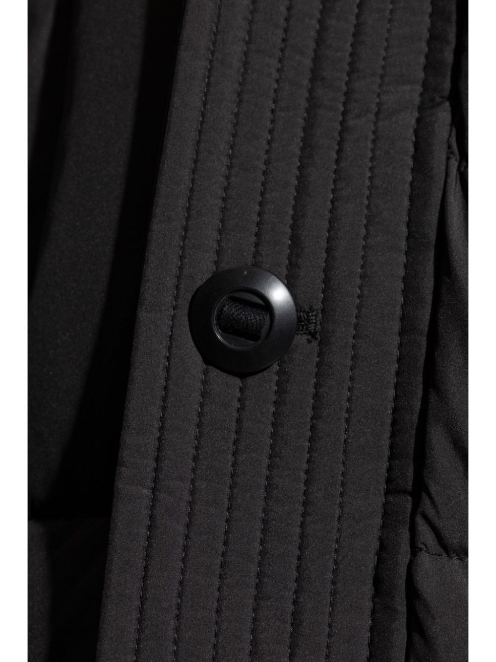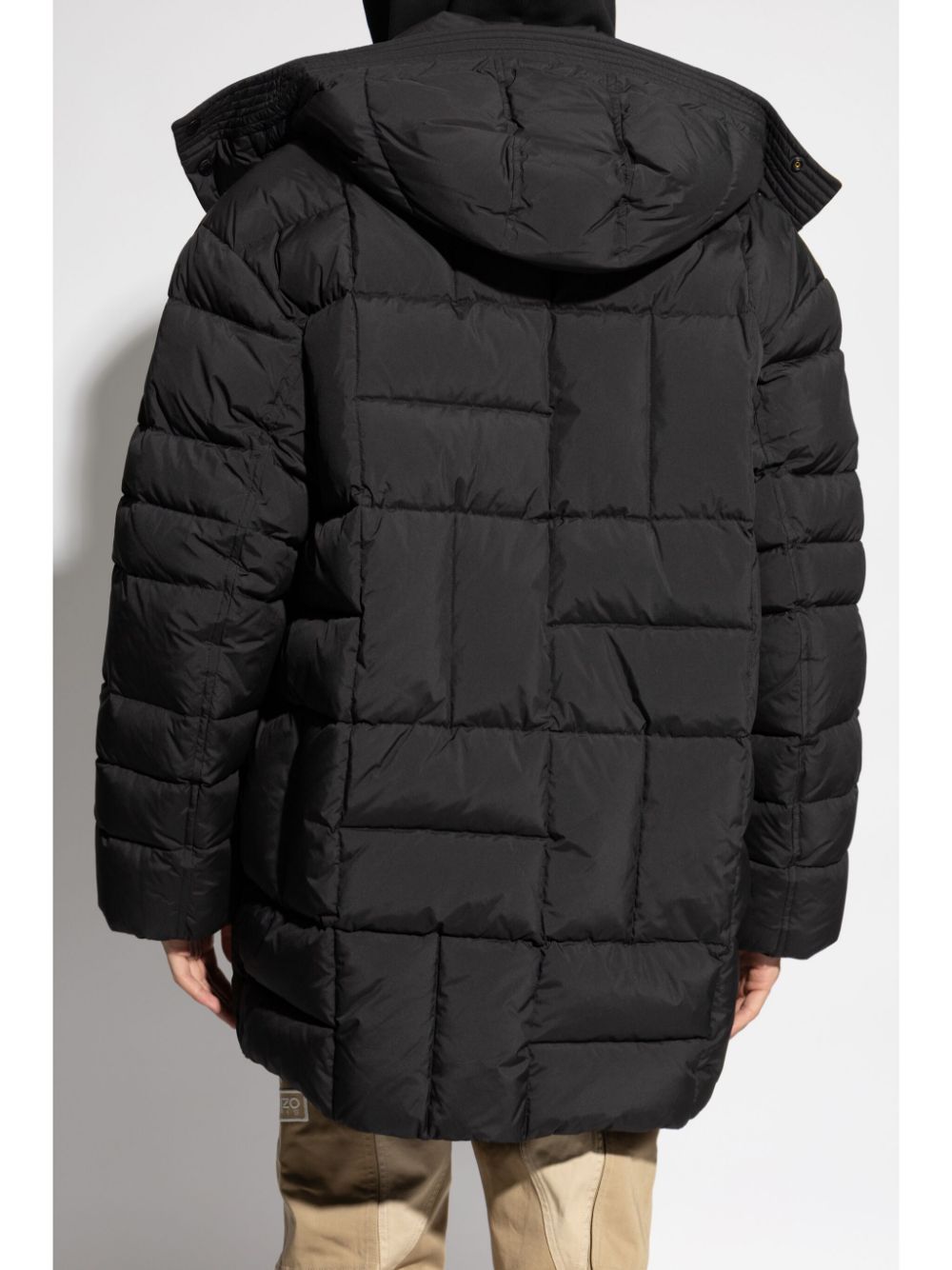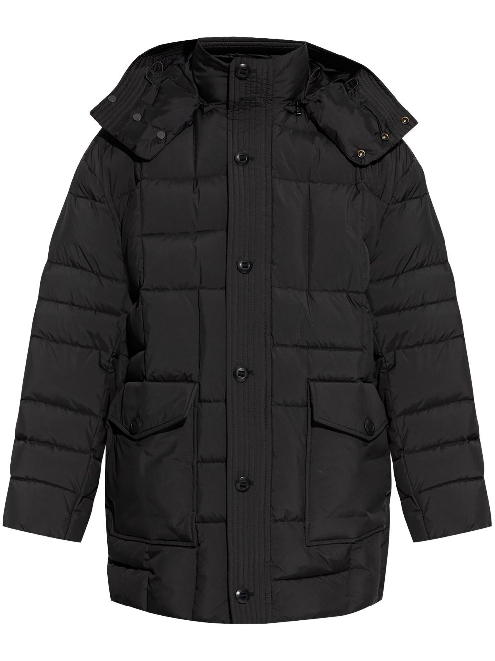 black padded design quilted feather down slouchy hood front button and zip fastening drop shoulder long sleeves two front flap pockets thigh-length straight hem