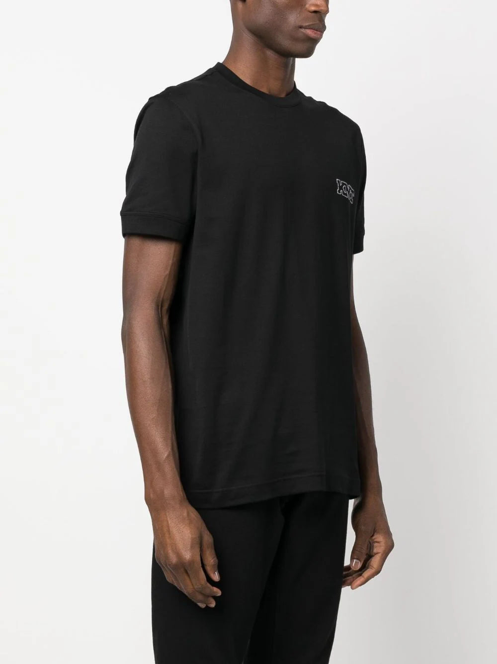 Czarny, bawełniany, logo haftowany na klatce piersiowej, szyja załogi, krótkie rękawy i prosty rąbek.