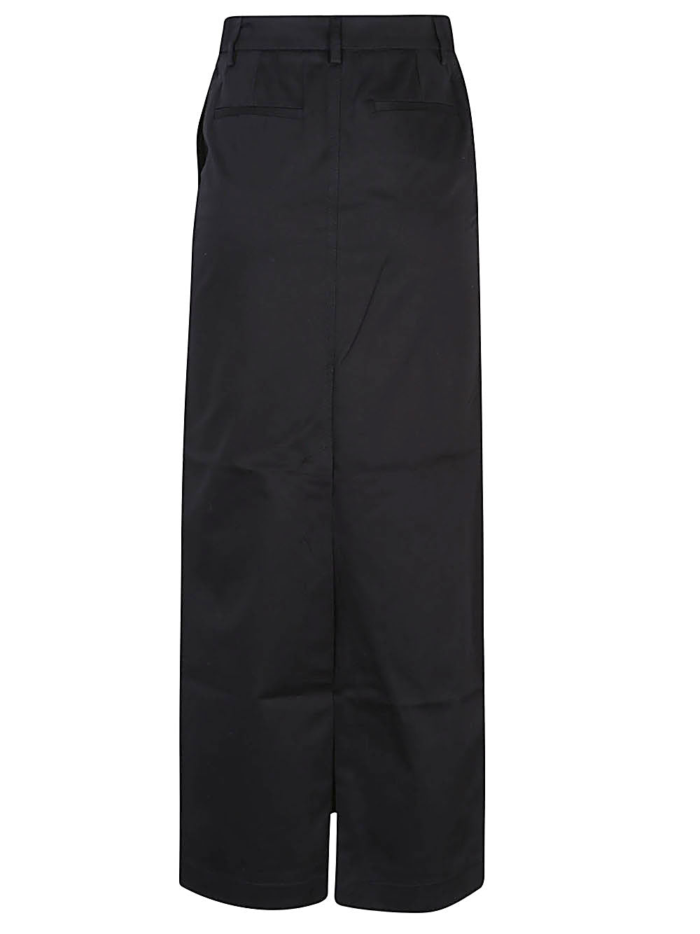 Długa ołówkowa spódnica z pętlami pasującymi w talii, dwie kieszenie na wąsie oraz zamykanie na suwak i guziki.