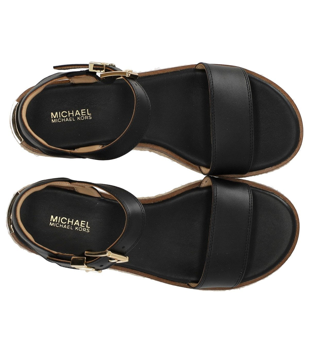 Sandał Richie autorstwa Michaela Korsa wykonany z czarnej skóry. Pasek kostki ze szczegółami logo złotym MK, wyściełana wkładka dla wygodniejszego dopasowania. Tkana platforma juty z gumową podeszwą. Wysokość pięty 4 cm.