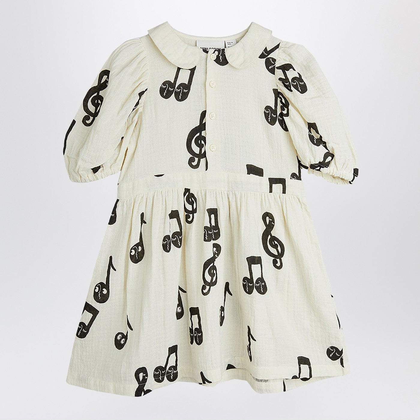 Mini Rodini sukienka w białej bawełnie z kontrastowymi nutami muzycznymi, charakteryzującymi się guzikami z przodu, puff rękawów i okrągłego kołnierza.