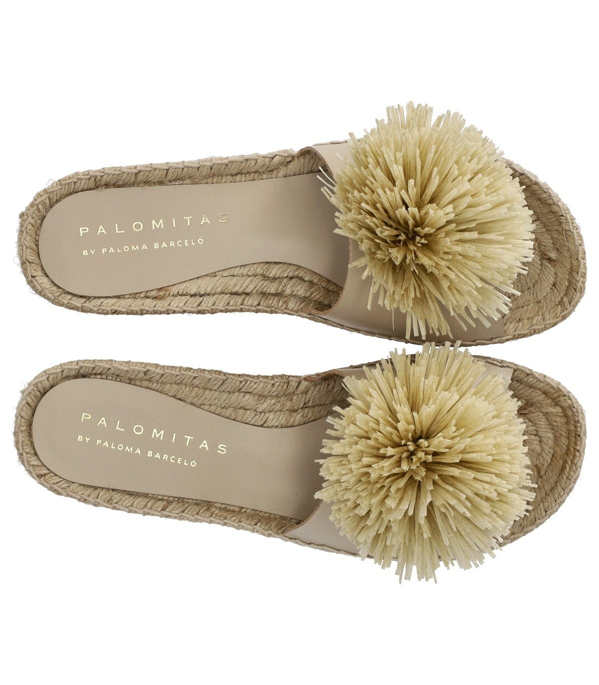 Sandał Palomitas wykonany z liny, z dużym beżowym skórzanym paskiem, ozdobionym Raffii Pom-Poms. Gumowa podeszwa dla wygody i lekkości. Wysokość 3 cm.