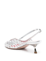 srebrny skórzany efekt metaliczny spiczasty stóp do wycięcia detale markowe skórzane wkładki skórzana podeszwa 45 mm środkowa klamra obcasowa.