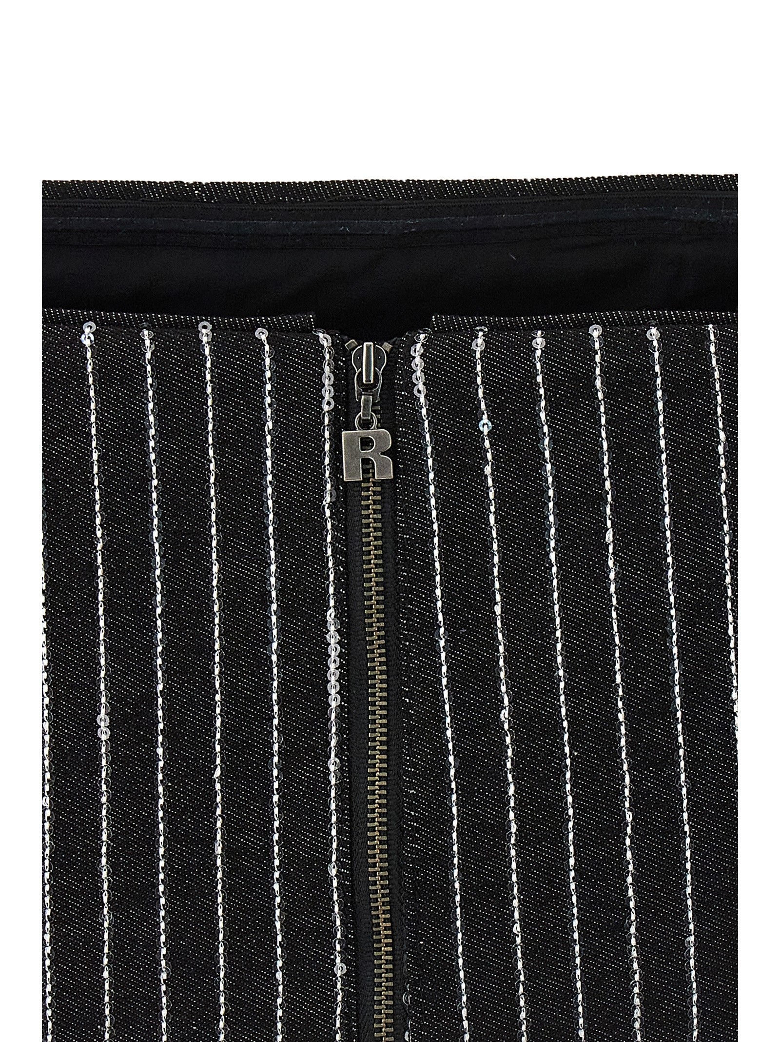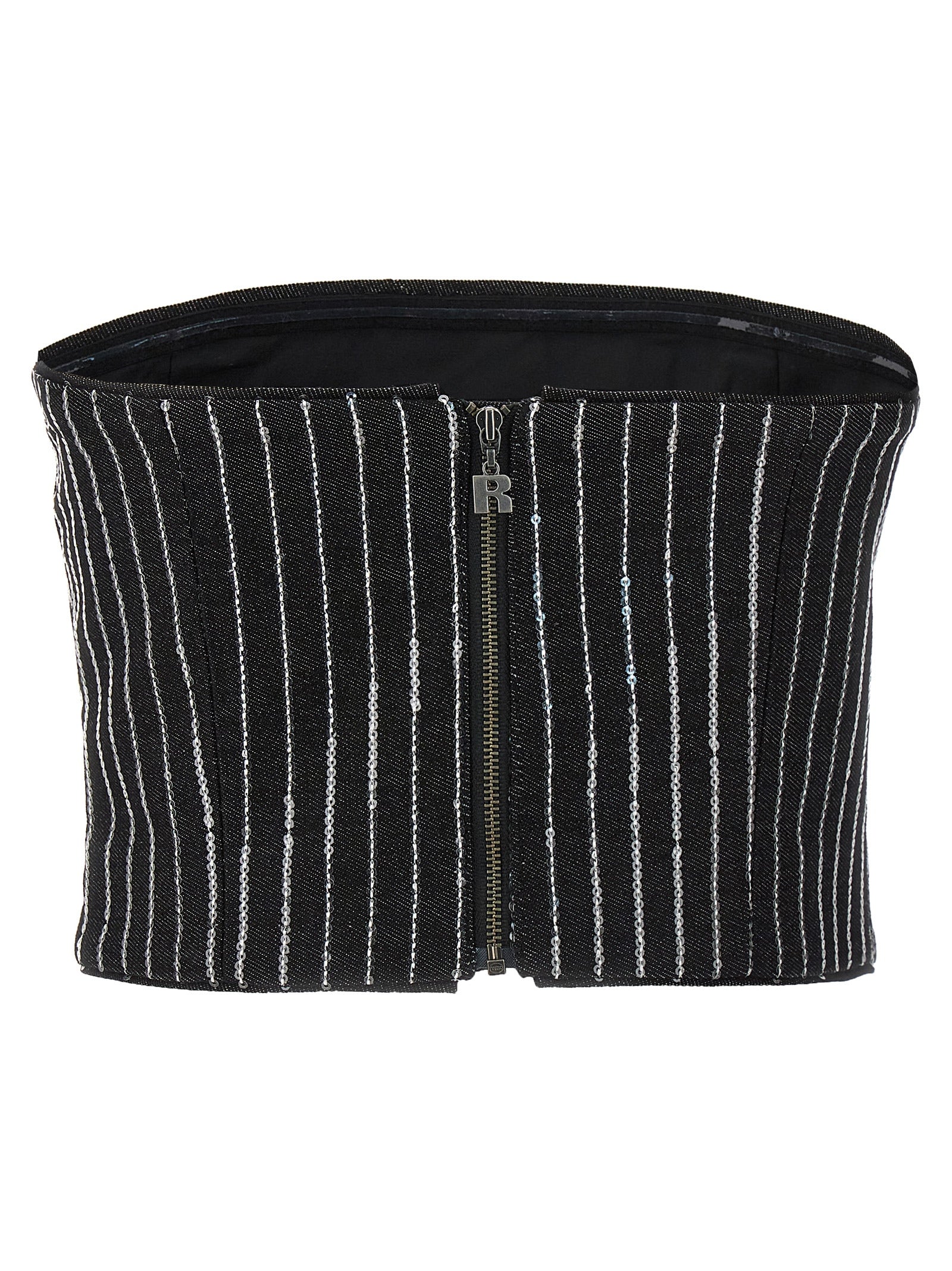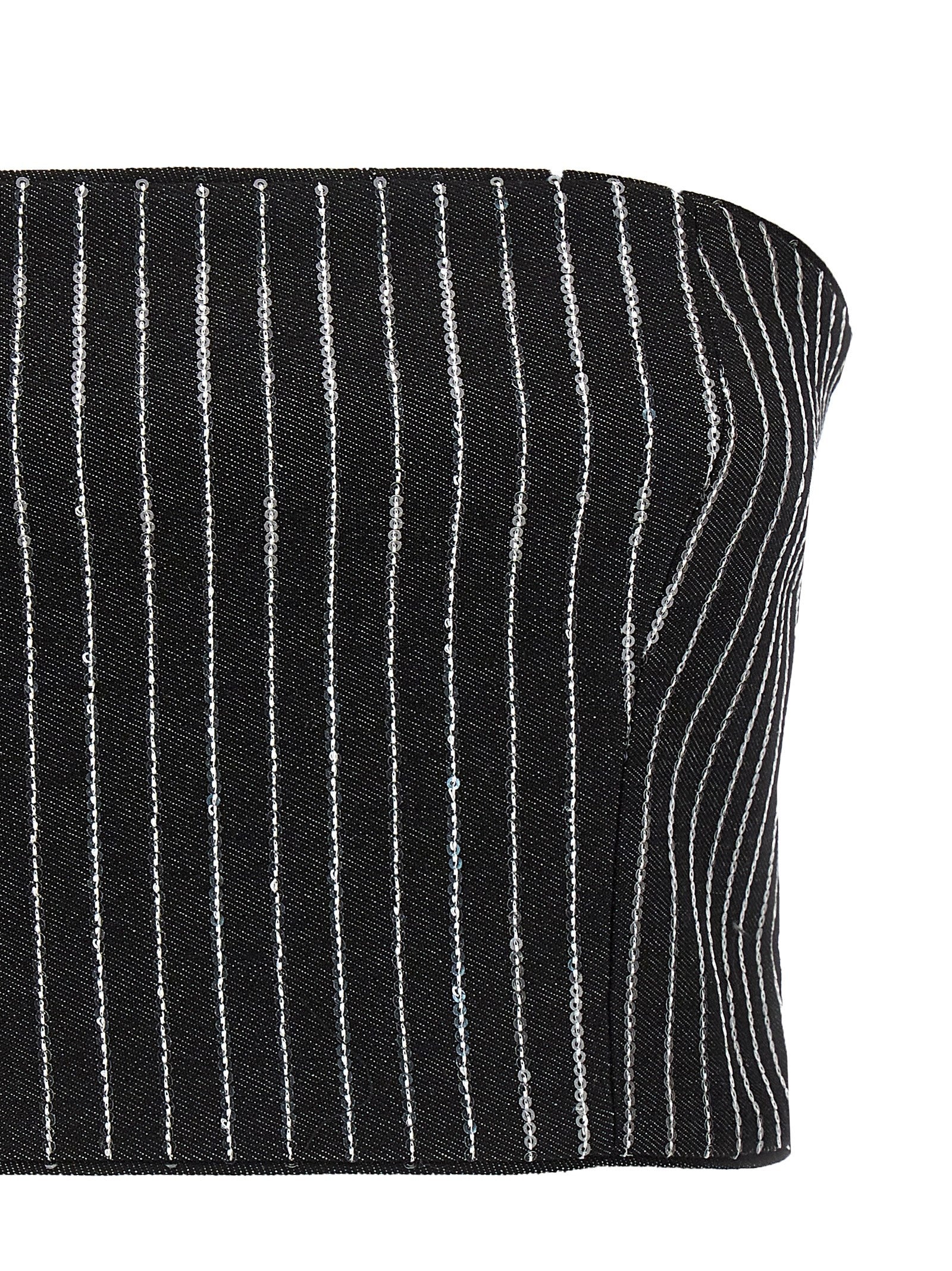 Uderz top w pinstripe dżinsie z cekinami, cienkimi paskami i zamknięciem zamka wstecznego.