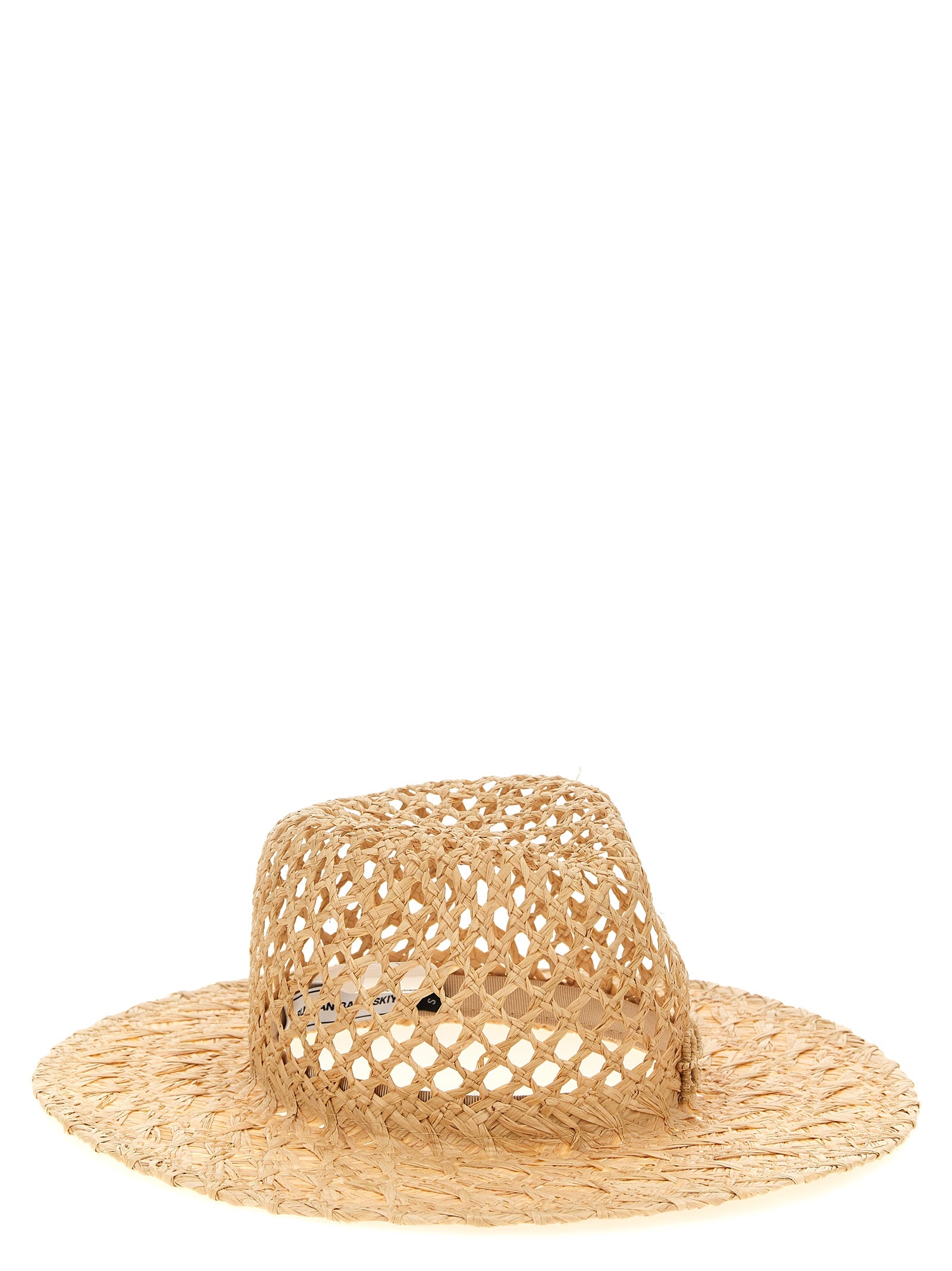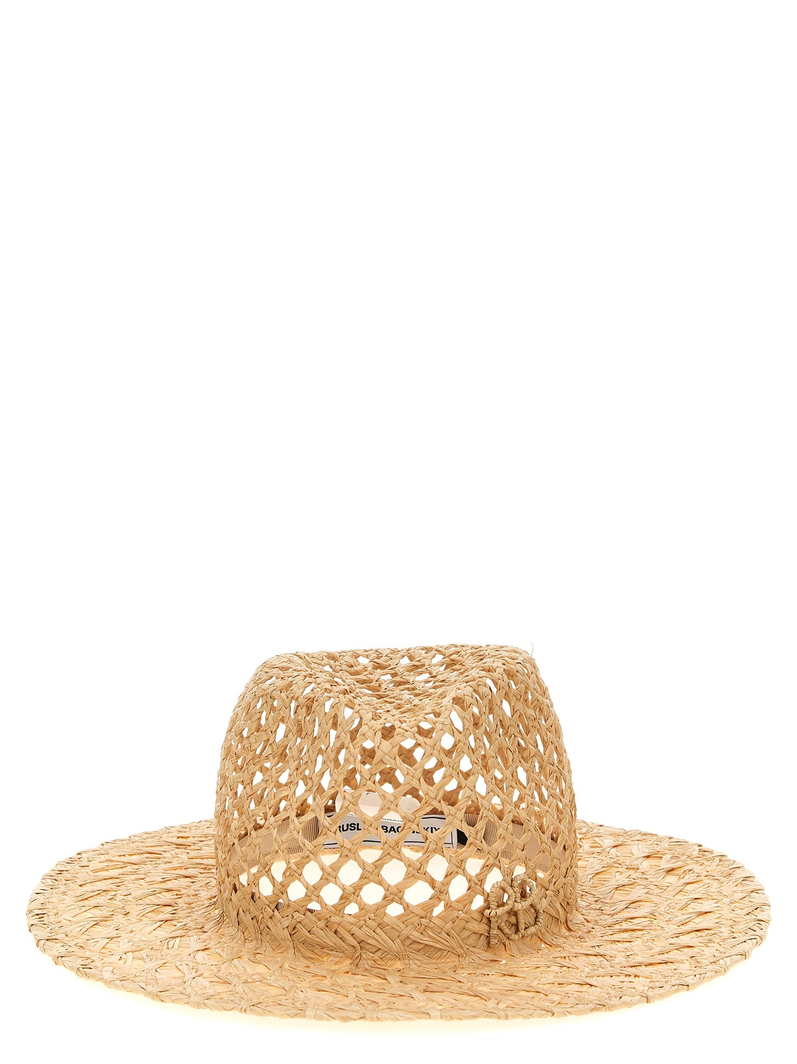 Pleciony kapelusz Raffii z wyciętymi detalami na skorupce, z przodu aplikacja Fedora z szerokim rondem, logo ton-on-tone.
