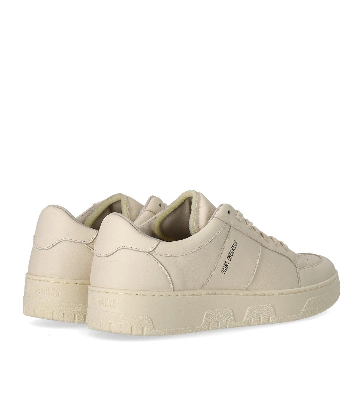 Sneaker klubu golfowego autorstwa Saint Sneakers wykonany ze skóry w kolorze kremowym ze złotym logo z boku i na języku. Perforowana palca i gumowa podeszwa, wysokość 3,5 cm.