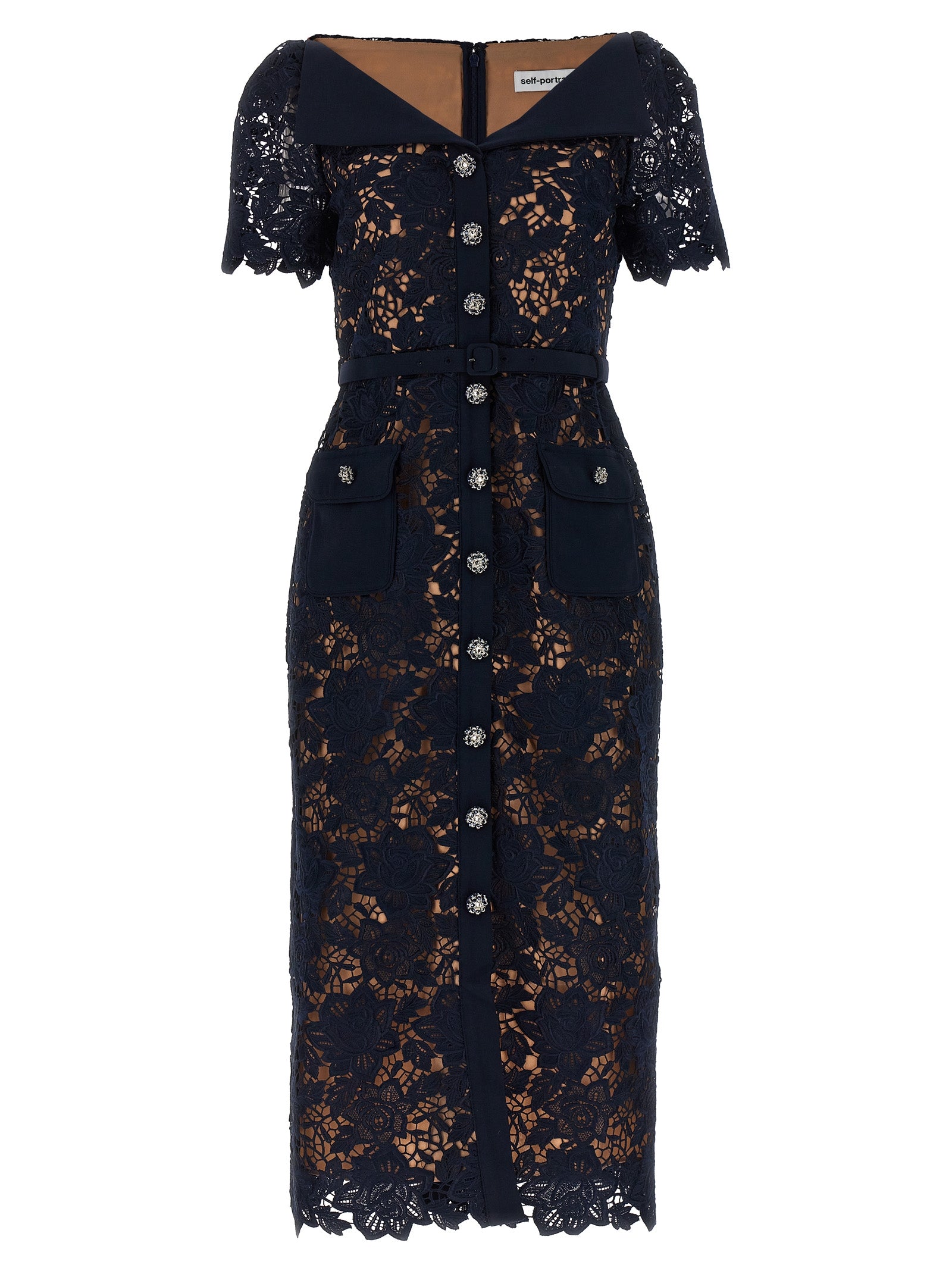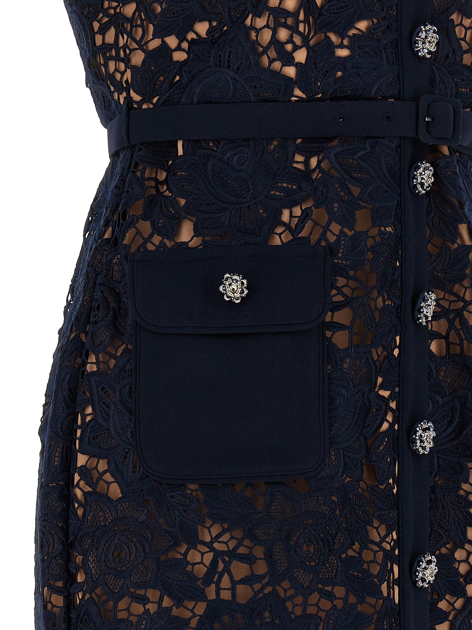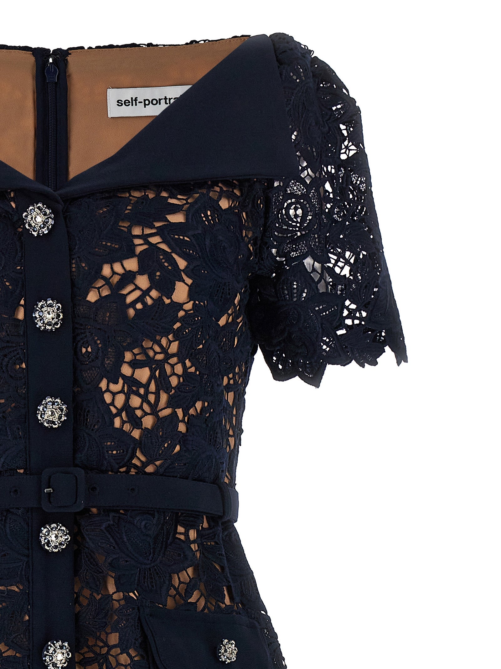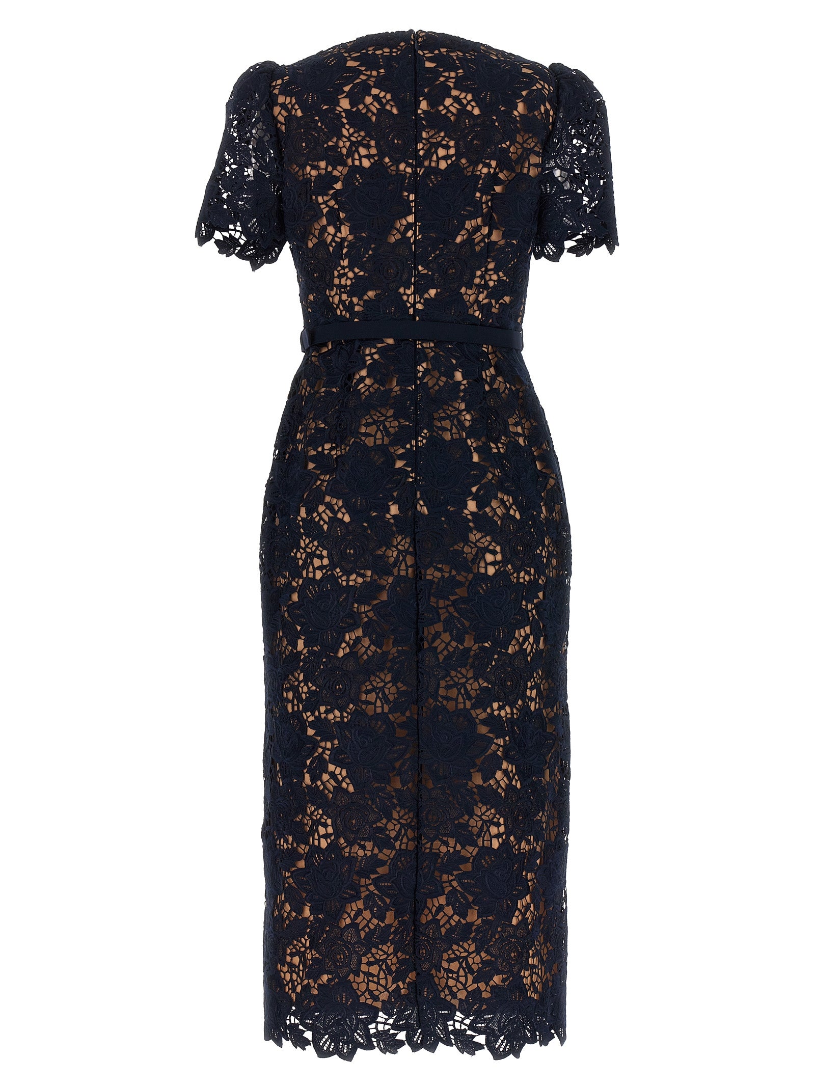 Koronkowa sukienka z koronką granatową z kontrastowej podszewki, aplikacja do guzika klejnotów, krótkie rękawy, zamykanie na zamek błyskawicznym, zdejmowany pas do pasa.