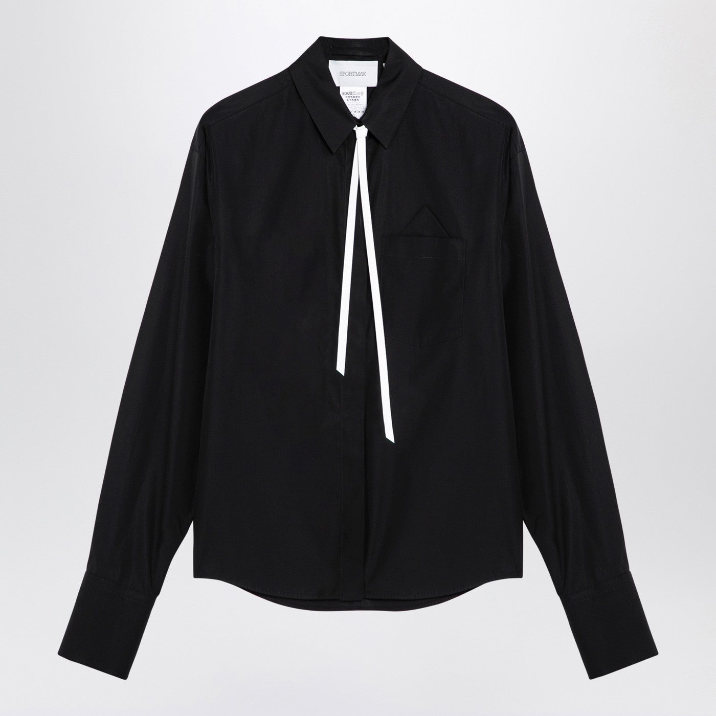 Koszula Sportmax w czarnym bawełnianym poplinie z klasycznym kołnierzem, cienkim krawatem na szyję, ukrytą przednią guziką, kieszenią piersi, długich, niskich rękawicach, mankietach guzików i zakrzywionym rąbku.