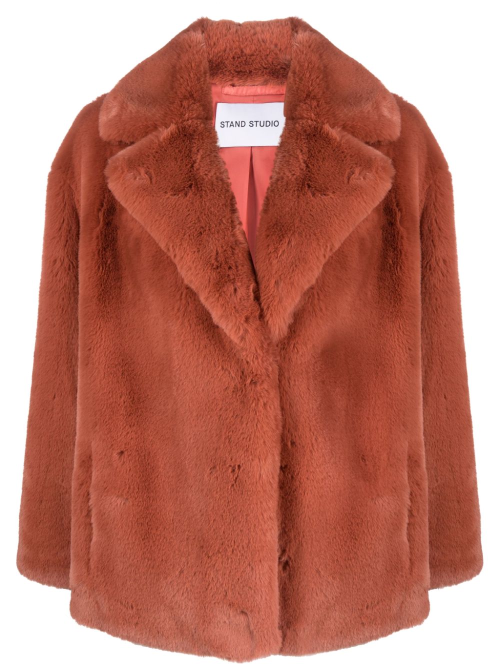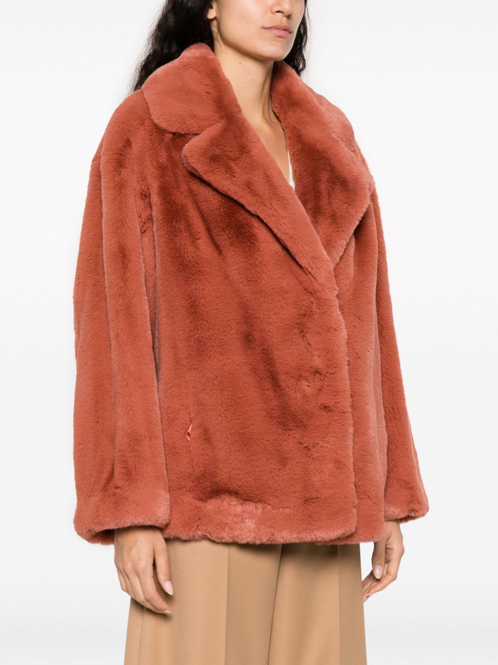 Kurtka Faux-Fur-furt z STAT Studio z terakotą pomarańczową, faux furme, tonalne szwy, klapy, ukryte przednie mocowanie, długie rękawy i prosty rąbek.