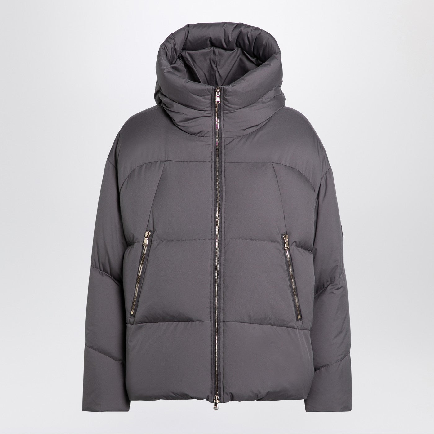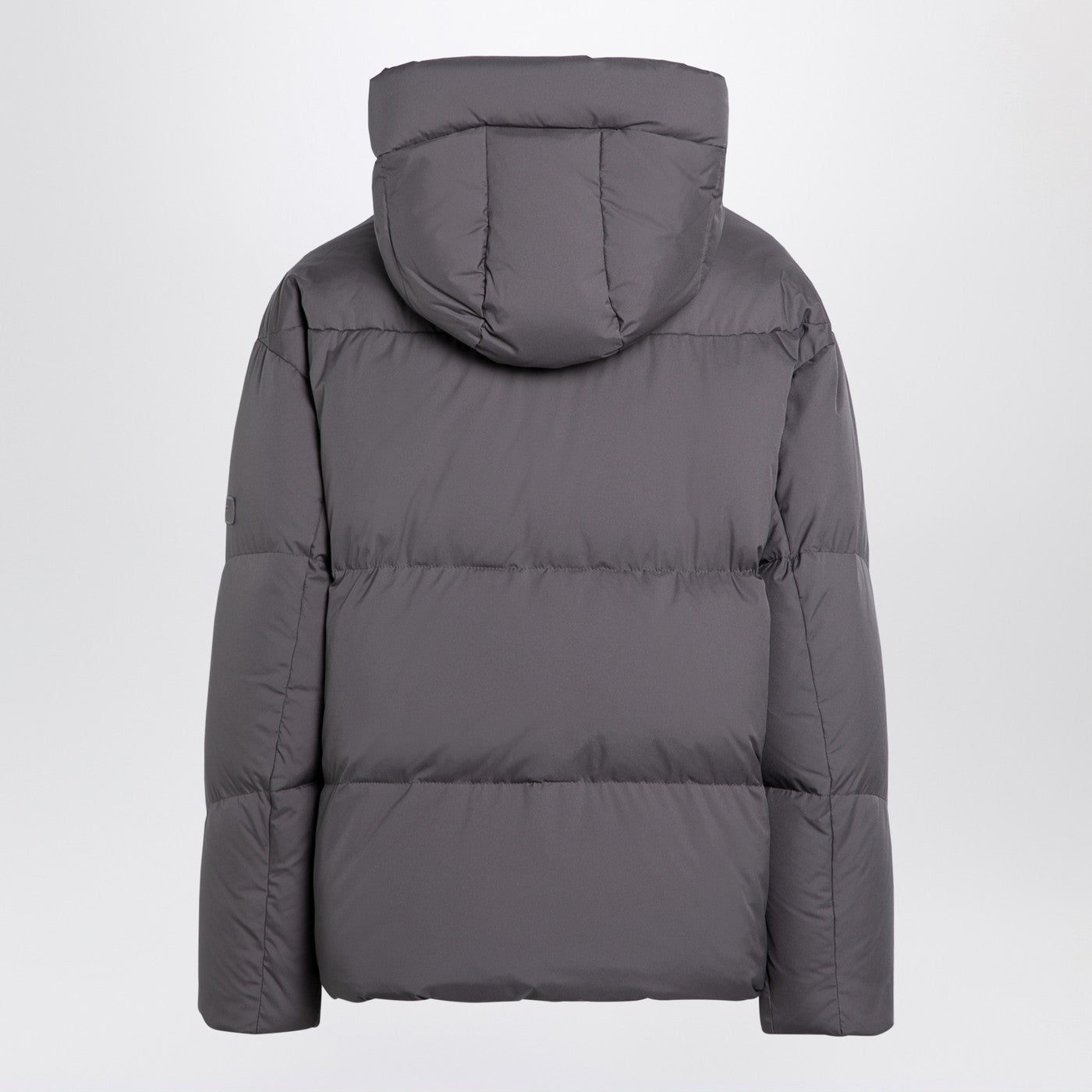 Grey Nylon Down Kurtka Tatras, zawierająca wysoki kołnierz z kapturem, długi rękaw z łatką logo, przednie mocowanie za pomocą podwójnego zamka i dwóch bocznych kieszeni z bokami z zamkiem błyskawicznym.