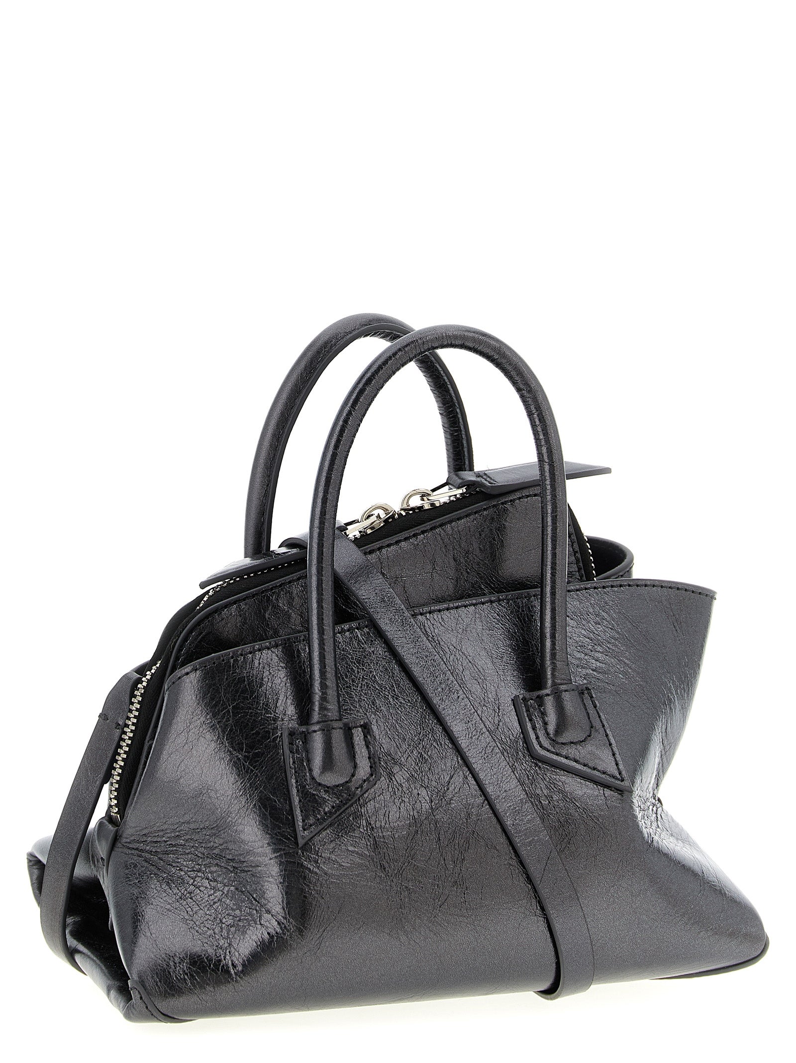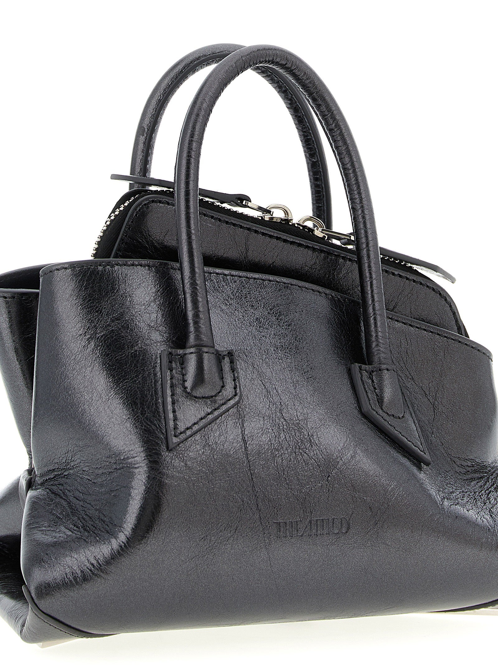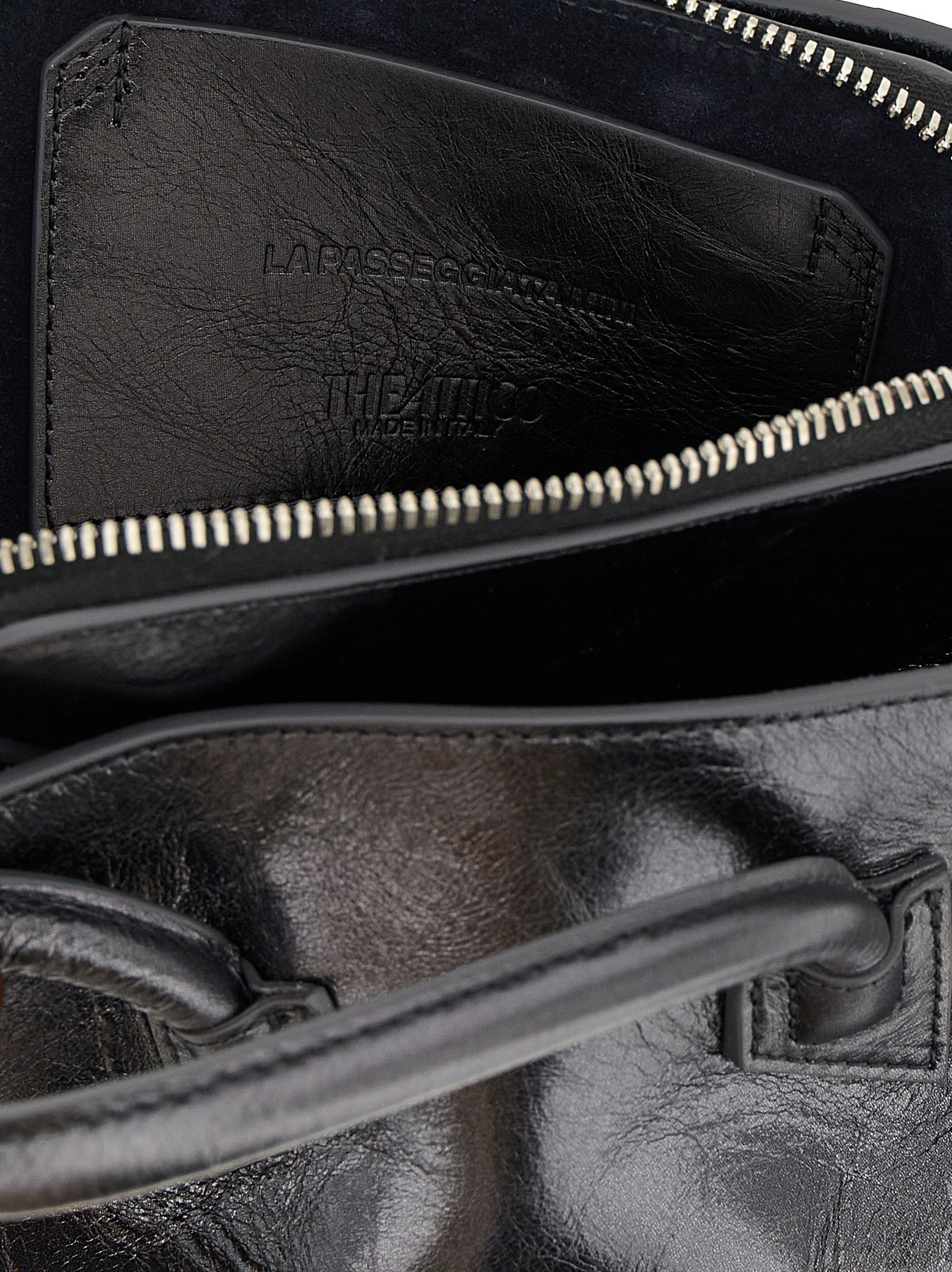 Torebka „La Passeggiata Mini” w skórce laminowanej Craquelé, przednie wytłoczone logo, podwójny uchwyt, górne zamykanie zamka, kieszenie boczne, sztywna baza z metalowymi stopami, wyjmowany pasek na ramię.