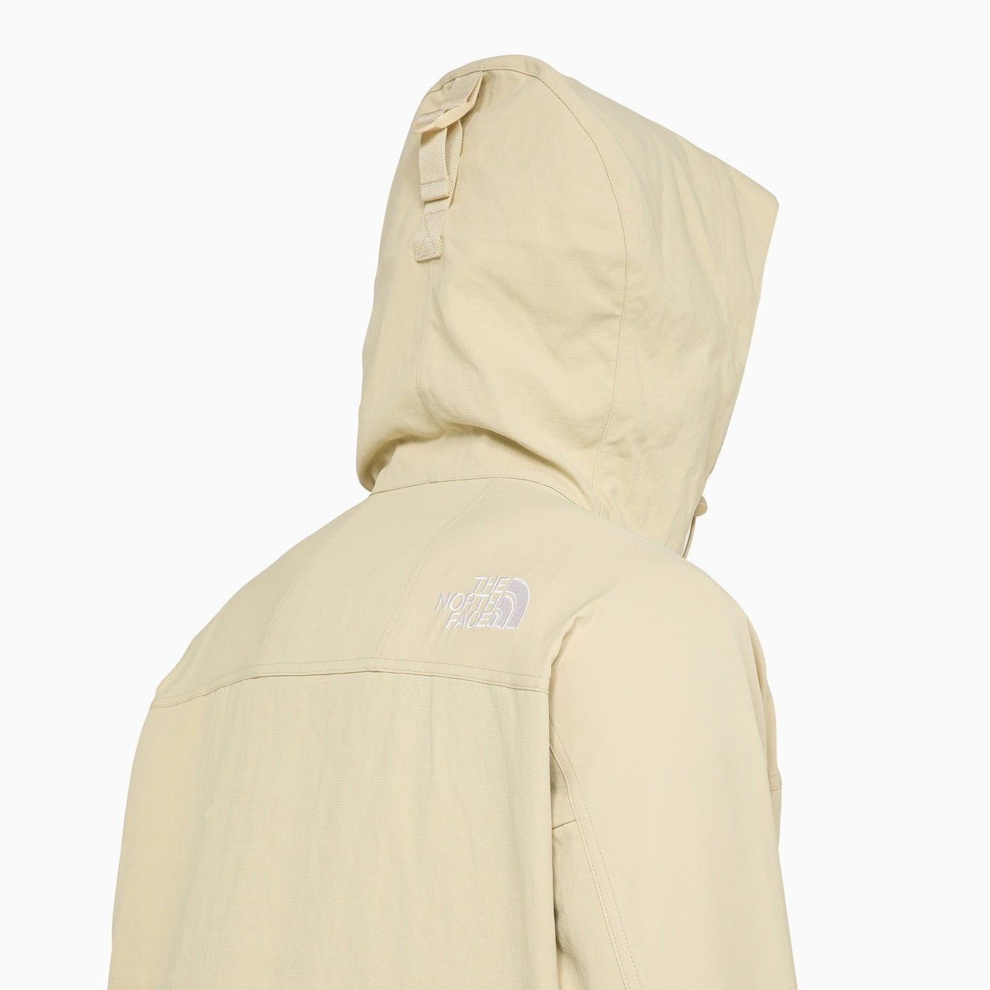 Lekka jasna beżowa kurtka z północnej twarzy, zawierająca mocowanie z przodu, wysoki kołnierz, regulowany kaptur z sznurkiem, kilka kieszeni z przodu, długie rękawy z regulowanymi mankietami na rzep i logo z napisem z przodu iz tyłu.